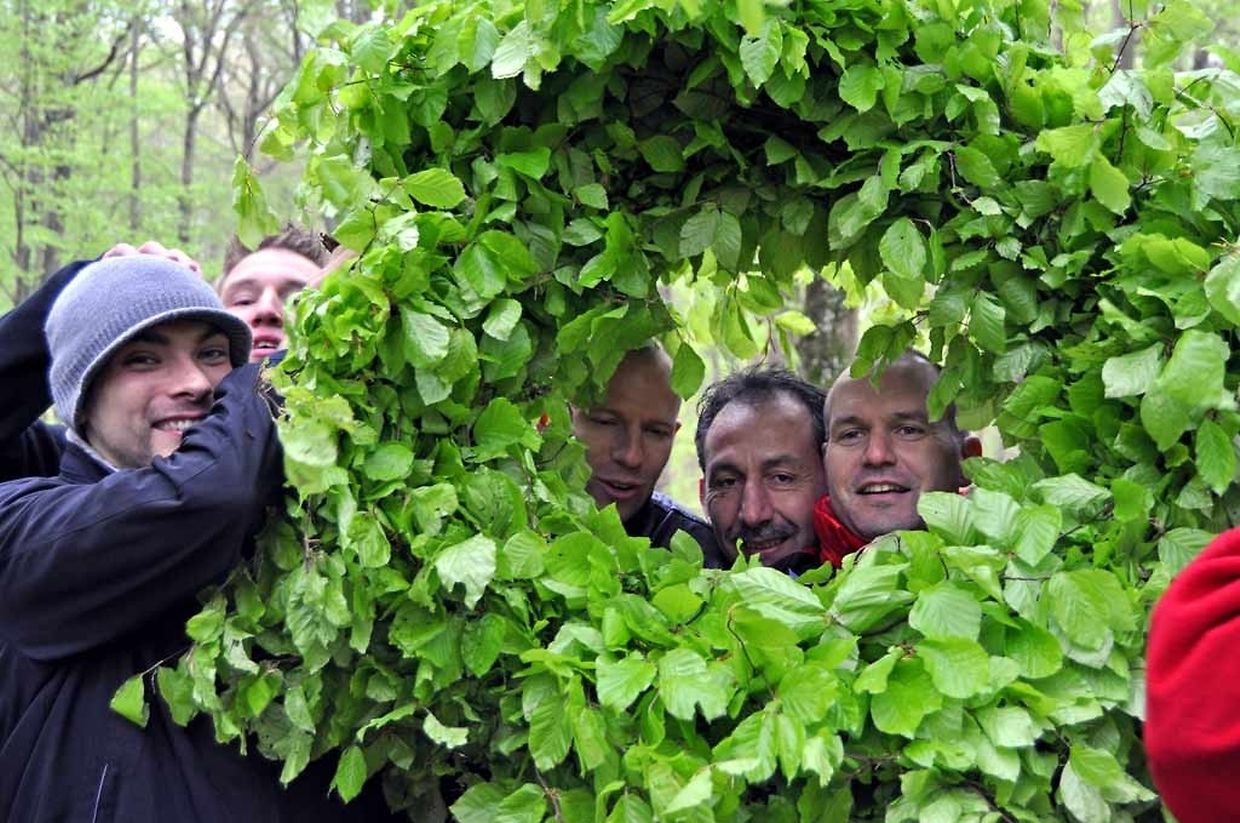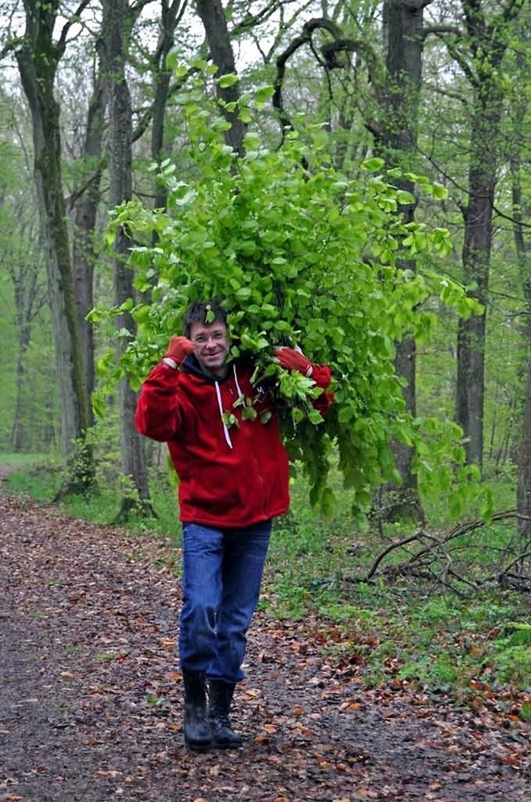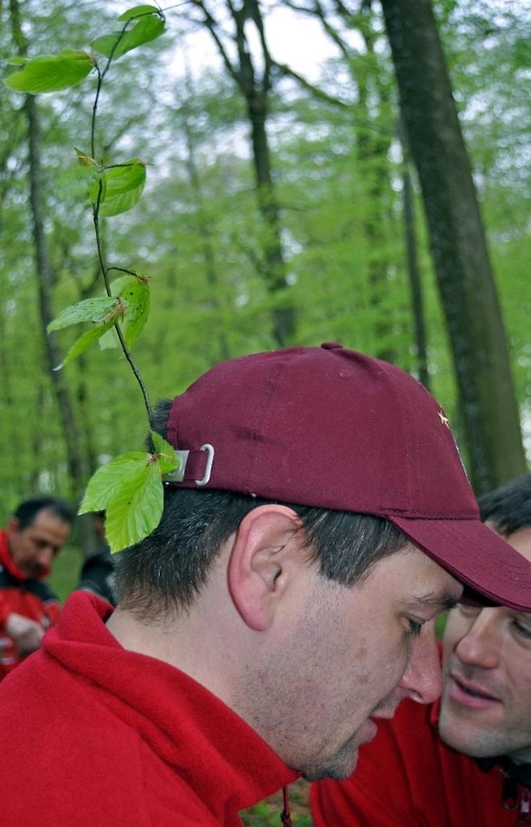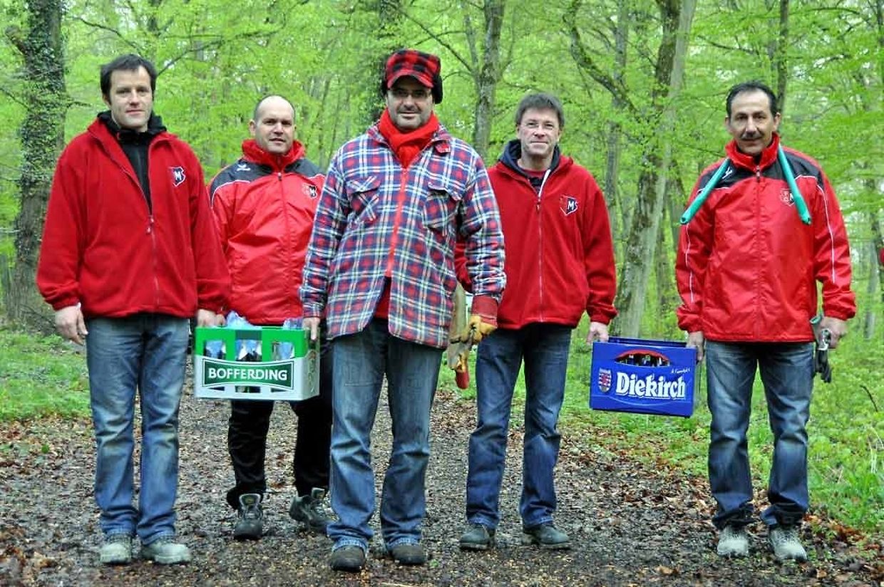 Um 7 Auer moies an der fréi hate sech eng 17 Leit um Parking vum Terrain 1 RDV ginn. Vun do aus ass een dann zesummen an de Bësch gefuer fir traditionelle Meekranz maachen ze goen.
