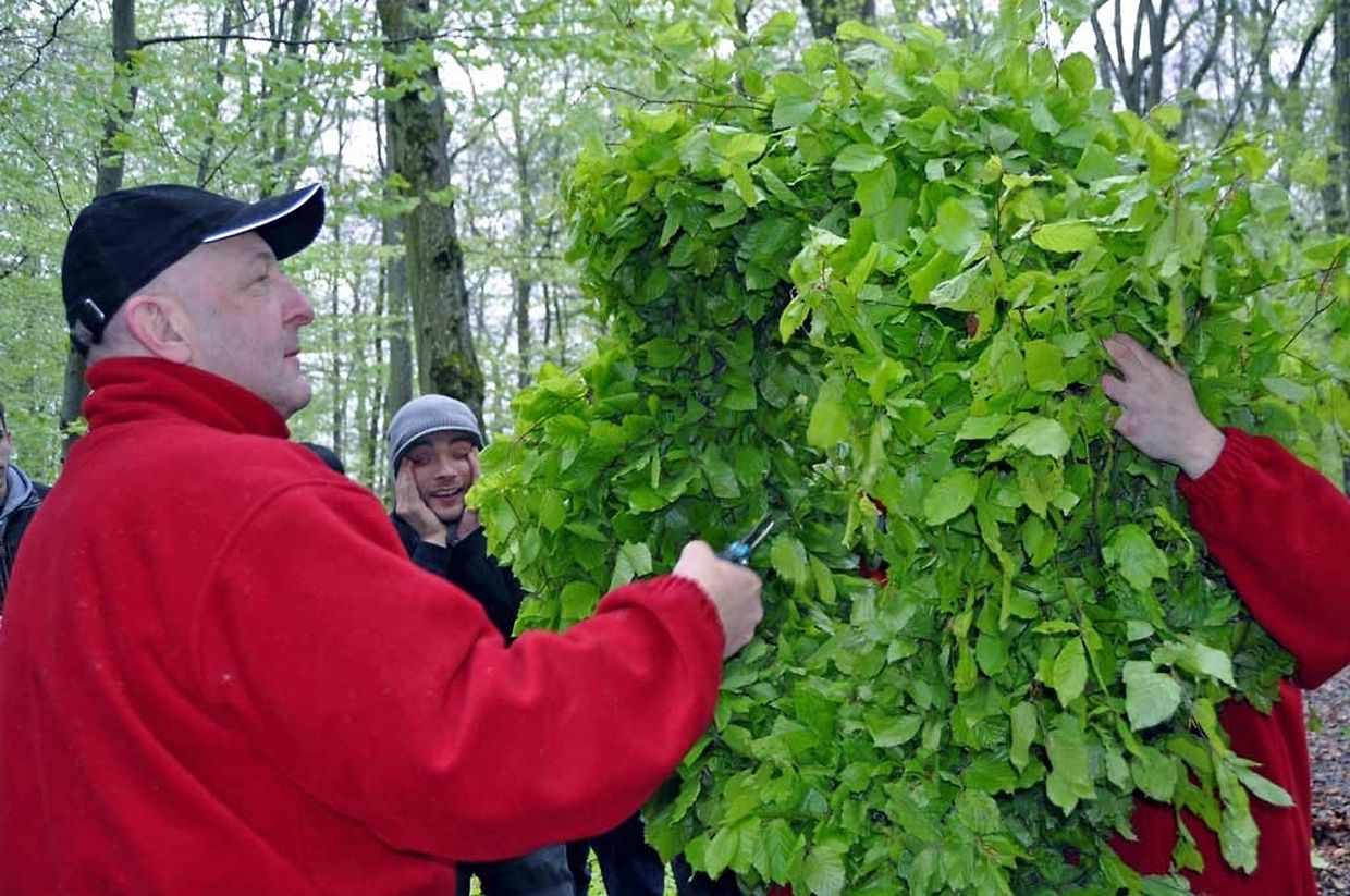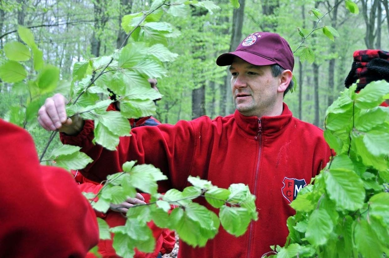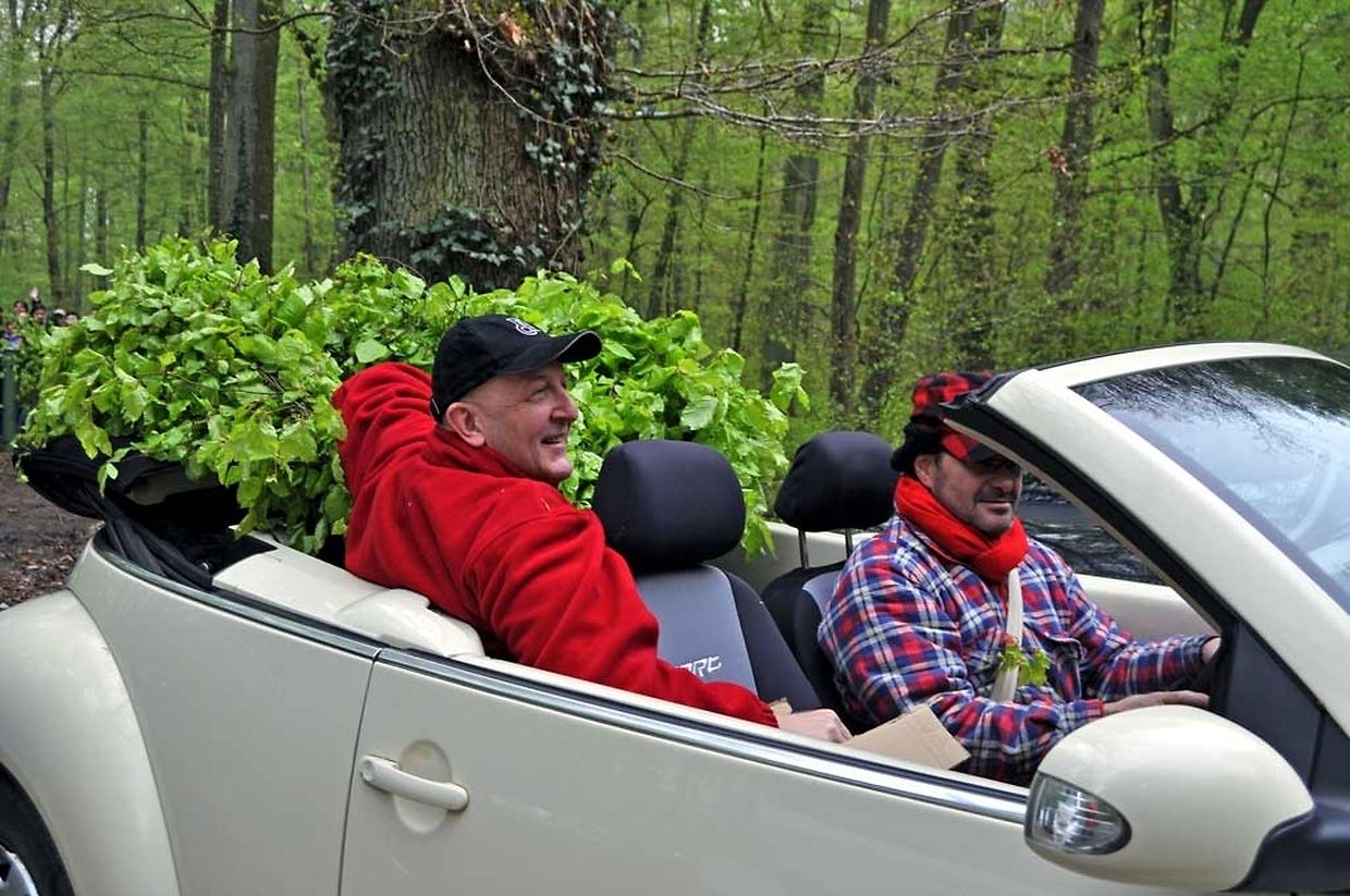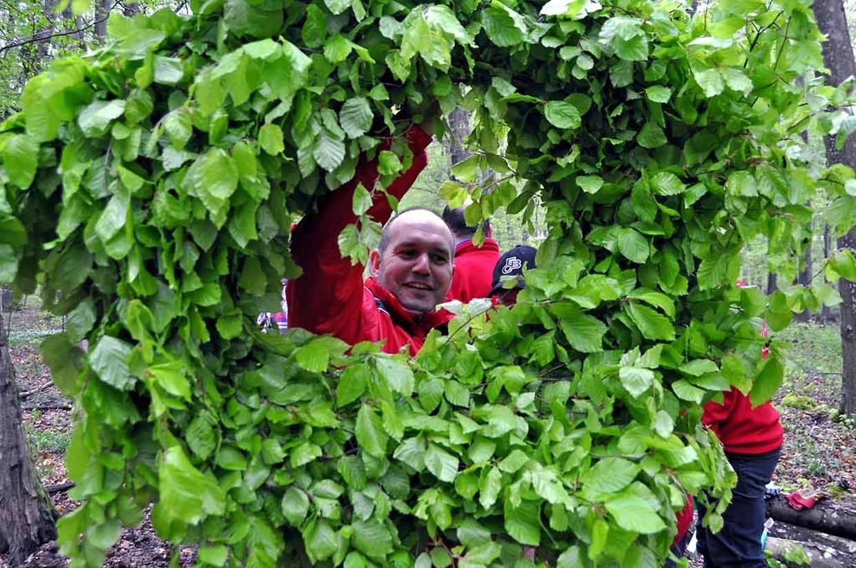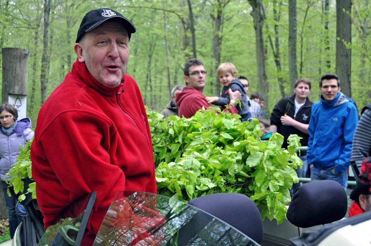 Um 7 Auer moies an der fréi hate sech eng 17 Leit um Parking vum Terrain 1 RDV ginn. Vun do aus ass een dann zesummen an de Bësch gefuer fir traditionelle Meekranz maachen ze goen.