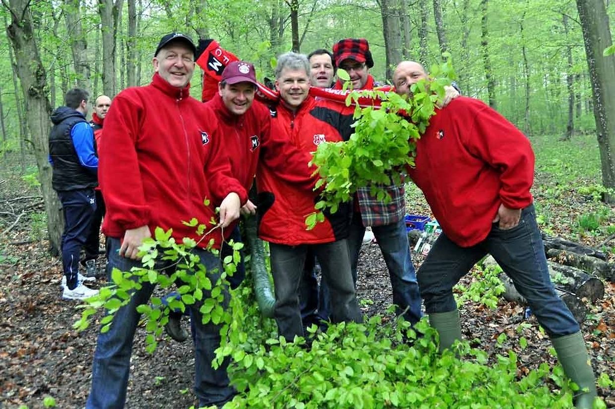 Den Dag virdrun hat et nach gutt gereent, mee moies um éischte Mee ass et Gott sei dank awer dréche bliwwen. D'Sonn ass nach hannert de Wolleke verstoppt bliwwen an esou war et net grad waarm. Virun zwou-dräi Woche war jo nach guer kee gréngt Blat an de Bëscher ze gesinn, um éischte Mee war dat schonns e bësse besser. D'Blieder waren awer nach zimlech kleng an et huet ee schonns gutt siche musse fir, dass eise Gäertner mat der richteger Matière Première beliwwert konnt gi fir e flotte Meekranz dorauser ze zwaffen. Am Endeffekt hunn eis fläisseg Aarbechter vum FC Monnerech genuch Gréngs fonnt an eise Meekranz huet nawell flott ausgesinn. Et war eng ganz gutt Stëmmung am Bësch wou eis zweet Équipe och ganz gutt vertruede war. Wou de Meekranz vum FC Monnerech esou wäit fäerdeg war, ass drop geprost ginn, esou konnt ee sech op déi Manéier e bësse wiermen. Do sinn dann déi nächst Veräiner komm. Den FC Monnerech ass vläicht sportlech gesinn net onbedéngt deen éischten an der Tabell, mee beim Meekranz ass den FCM awer ëmmer deen éischten an einsam Spëtz.