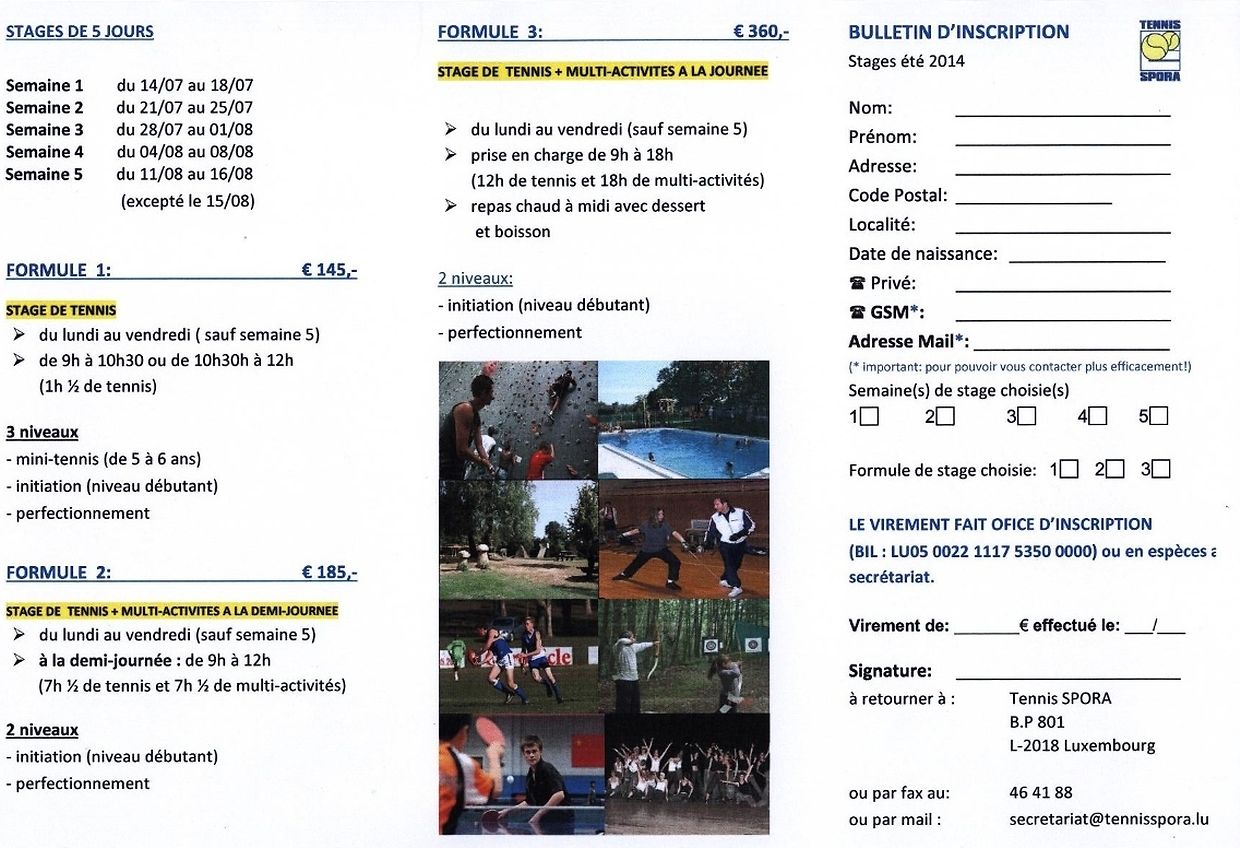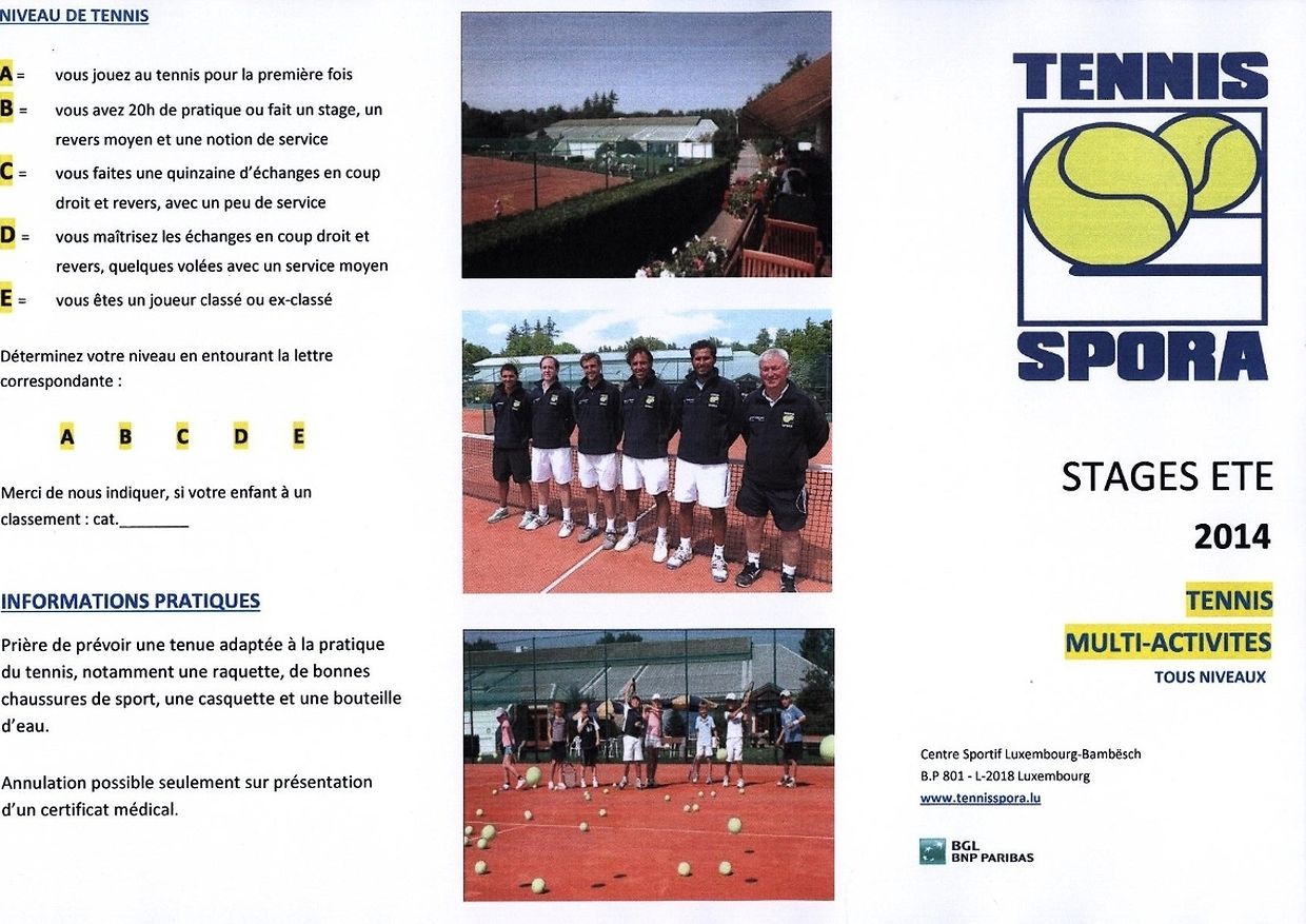 Luxembourg - Mühlenbach Tennis Spora Stage été 2014 - Tennis Multi-Activités - 2ème semaine Spora Tennis 5 Picture Gallery Please scroll down,to see more pictures. Published on Saturday, 26 July, 2014 at 19:39 Stage été 2014 - Tennis Multi-Activités Plus de 40 enfants ont de nouveau participé à la 2ème semaine de Stage au Tennis Spora au Centre Sportif Bambësch. Des inscriptions sont encore possibles pour les semaines: Semaine du 04/08 au 08/08 Semaine du 11/08 au 16/08 (excepté 15/08) 3 Formules possibles! Tél. : 46 15 51 Report inappropriate content More news by Spora Tennis > Stages Tennis Multi-Activités Eté 2016 - Tous niveaux 14/06/16 Luxembourg - Mühlenbach Terrains hardcourts au Tennis Spora – Inauguration 12.09.2015 26/09/15 Luxembourg - Mühlenbach Stages Tennis Multi-Activités Eté 2015 14/07/15 Luxembourg - Mühlenbach Stages Tennis Multi-Activités Eté 2015 24/06/15 Luxembourg - Mühlenbach Fête du 1er Mai au Tennis Spora 03/05/15 Luxembourg - Mühlenbach