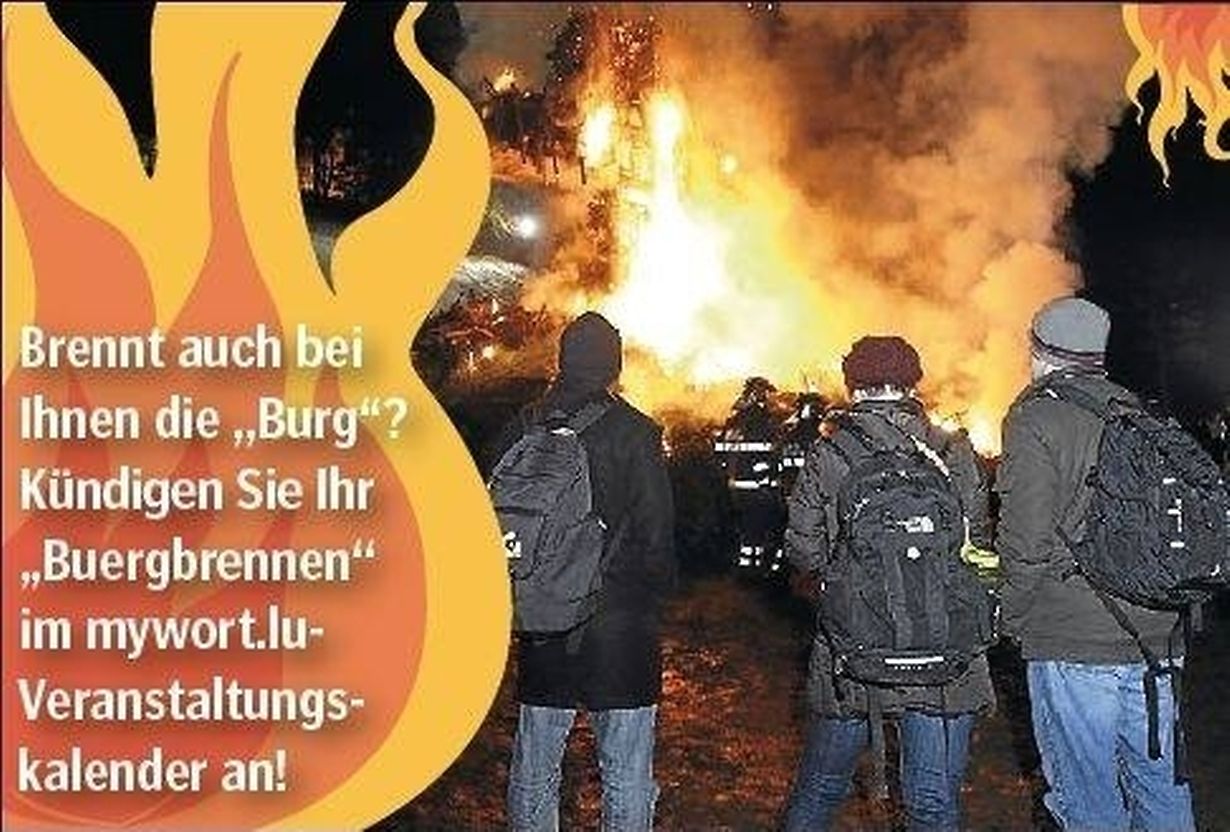 In vielen Gemeinden werden am Wochenende vom 13. Februar, entweder am Samstag oder Sonntag, zahlreiche "Burgen" von den lokalen Vereinen errichtet. Anschließend wird nach alter Tradition der Winter durch das Anzünden der "Buerg" vertrieben.