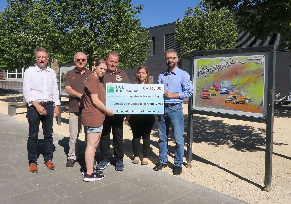 Am vergangenen 28. Mai war in Munsbach in der kommunalen Mehrzweckhalle „An der Dällt“ eine groß angelegte Retrospektive auf den Autocross-Rennsport in Luxemburg veranstaltet worden. Anlass dazu war der 50. Jahrestag des ersten Rennens dieser Art in Luxemburg gewesen. In den 1990er Jahren war die nationale Autocross-Aktivität zum Erliegen gekommen (siehe LW vom 7. Juni). Die Jubiläumsveranstaltung „50 Joër Lëtzebuerger Auto-Cross“ war von Jerry Lang (3. v. li. auf dem Foto) initiiert worden. Sie kannte einen überwältigenden Erfolg, so dass am Ende ein netto Einnahmenüberschuss von 4 025 Euro verbucht werden konnte. Am ersten Juli-Samstag wurde dieser von Jerry Lang, seiner Tochter Mandy, Willy Andres erster Verbandspräsident, und Tania Schleich (die noch am Sonntag zuvor in der Eifel ein Rennen gewonnen hatte), wie vorgesehen, an die Fondation Autisme überreicht. Die ansehnliche finanzielle Unterstützung nahm Patrick Simon im Namen der Fondation dankend entgegen. - Bürgermeister Jean-Paul Jost wohnte der kleinen Zeremonie bei. Beim abschließenden Umtrunk riefen der Schüttringer Gemeindevorsteher und Willy Andres die einstigen Schüttringer Rennen, die damalige gute Zusammenarbeit und die bereits erwähnte sehr erfolgreiche Jubiläumsveranstaltung in Erinnerung. – Autocross-Freunde und -Nostalgiker seien auf die von Jerry Lang gegründete Facebook-Gruppe „Lëtzebuerger Auto-Cross Nostalgie“ hingewiesen.