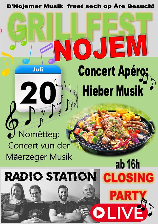 D'Musik invitéiert op hirt Grillfest e Sonndig, de 20. Juli beim Festsall zu Nojem. Fir den Apéro spillt d'Hieber Musik iech e flotte Concert. Am Nomëtteg spillt d'Mäerzeger Musik. Den Entrée ass fräi. WHOW! Ab 16 Auer ass grouss CLOSING-Party mat der Liveband Radiostation! De Grill bleiwt bis an den Owend eran un! Avis aux amateurs!