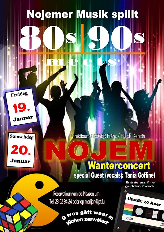 D’Musik invitéiert op hire Wanterconcert e Freideg, de 19. a Samschdeg, den 20. Januar 2024 am Festsall zu Nojem. Um 20.00 Auer spillt d' Musik ënnert der Leedung vum Fränz Breger a Kerstin Plier e flotte Concert mam Thema "80s meets 90s". Fir Iessen a passend Gedrénks ass gesuegt. Den Entrée ass fir e gudden Zweck. Reservéiert äer Plaazen um Tel. 23629424 oder mailt op marijan@pt.lu.