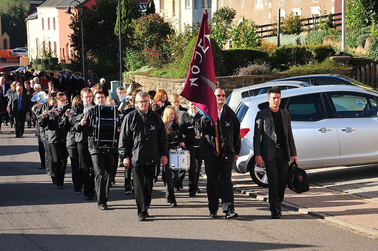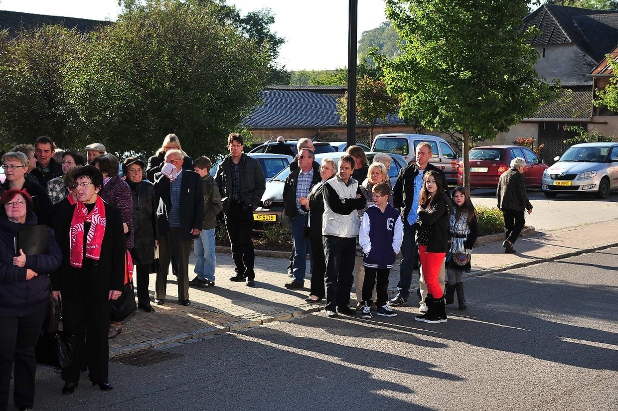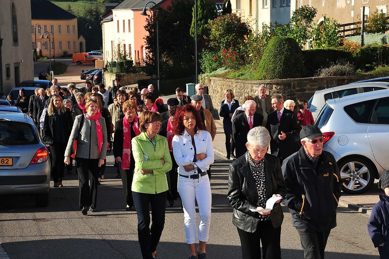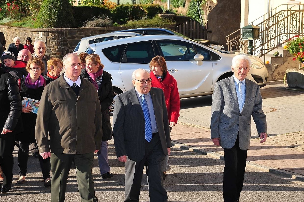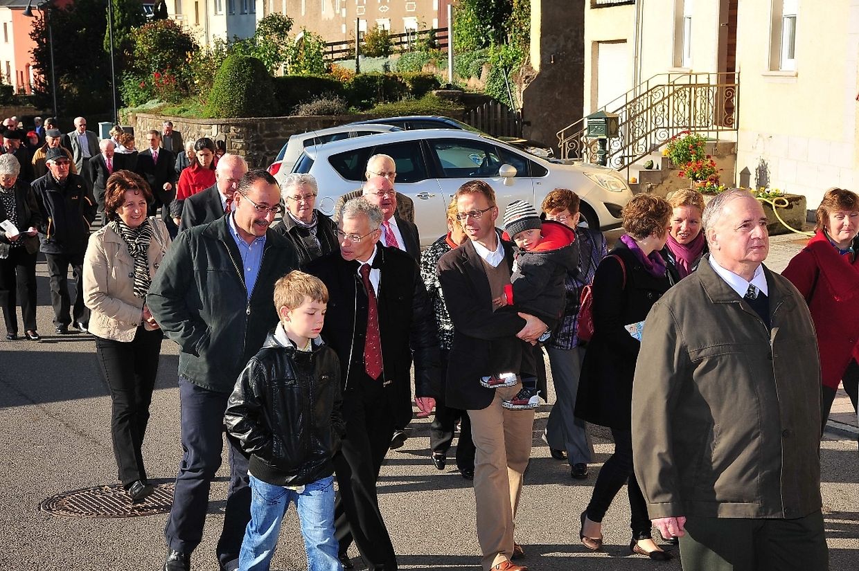 Im Festzug angeführt von der „ Nojemer Musik“ ging es dann zum offiziellen Empfang im Festsaal wo Anne Reding dem Jubilar gleich zu Beginn als Anerkennung einen Blumenstrauß überreichte. Im Anschluss an seine Gratulationen ging Kirchenratspräsident Camille Faber in seiner Ansprache auf das 50- jährige Wirken als Priester und Missionar im Dienste der Mitmenschen von Pater Alfred Nothum ein. Geboren im Jahre 1932 als ältester Sohn von fünf Kindern des Ehepaares Alphonse Nothum aus Ell und Marie Bodevin aus Nagem wurde Alfred Nothum nach seinem Studium mit der am 2. Juli 1961 in Rom zum Priester geweiht und Primiz wurde am 23. Juli 1961 in seinem Heimatort in Nagem gefeiert. Als Missionar wirkte Pater Nothum während 25 Jahren im Kongo um später im Kamerun tätig zu werden. Von 1993 bis 2000 wirkte er auf der katholischen Universität von Zentralafrika in Yahoundé, wo er eine Abteilung für Kirchenrechte gründete und auch leitete. Danach wurde Pater Nothum bis 2004 zum zweiten Direktor auf derselben Universität ernannt. Seine letzte Etappe war während vier Jahren als Priester in einer großen Pfarrei im Kamerun zu wirken. Camille Faber wünschte dem „goldenen“ Herz- Jesu- Priester in seinem wohlverdienten Ruhestand weiterhin Zufriedenheit sowie eine gute Gesundheit. Als Jubiläumsgeschenk wurde Pater Alfred Nothum für seine laufende Projekte im Kamerun mit einer Spende über 3 900 Euro seitens des Pfarrverbandes Ospern unterstützt. Weitere 2 000 Euro kamen seitens der „ Fraen a Mammen Gemeng Ell“ zusammen. Mit diesem Geld werde einerseits das nötige Material für ein bereits gebautes „ centre de santé“ angeschafft werden und andererseits die Finanzierung eines Geländewagens für seinen Nachfolger gesichert werden, der insgesamt 22 Dörfer in dessen Pfarrei betreuen muss. Herzlich und gerührt bedankte sich Pater Alfred Nothum bei allen Beteiligten für den freundlichen Empfang in seinem Heimatdorf Nagem, der ihm stets in guter Erinnerung bleiben wird. ( FOTOS: CHARLES REISER)