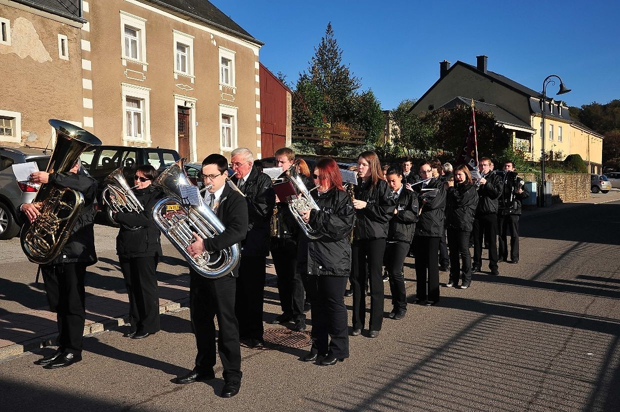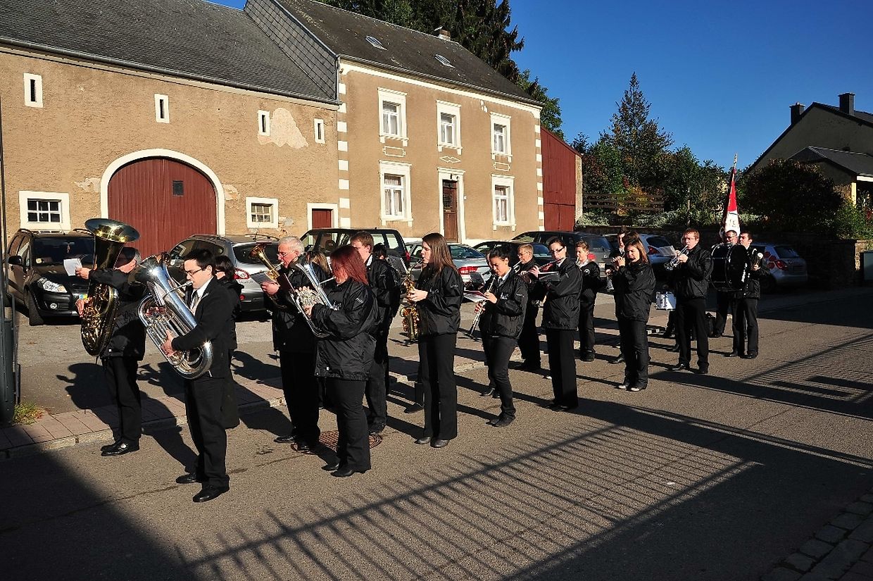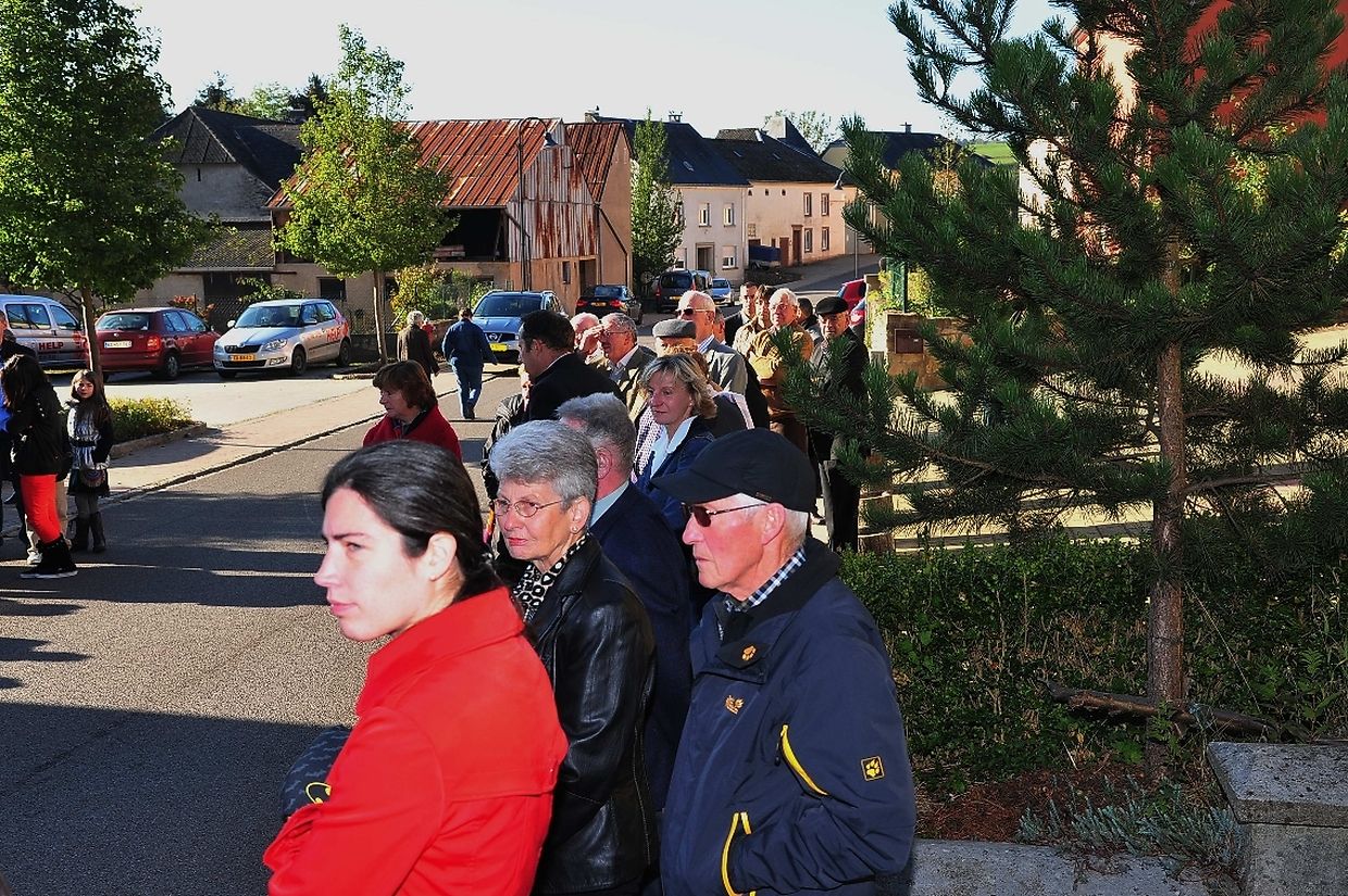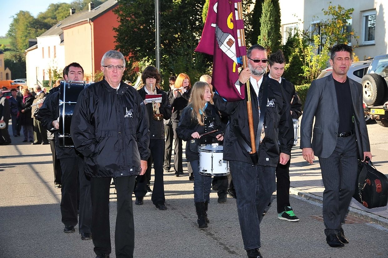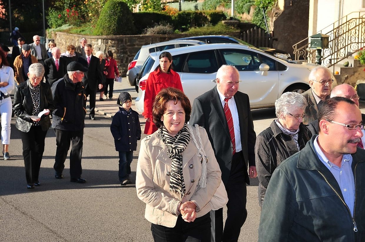 Im Festzug angeführt von der „ Nojemer Musik“ ging es dann zum offiziellen Empfang im Festsaal wo Anne Reding dem Jubilar gleich zu Beginn als Anerkennung einen Blumenstrauß überreichte. Im Anschluss an seine Gratulationen ging Kirchenratspräsident Camille Faber in seiner Ansprache auf das 50- jährige Wirken als Priester und Missionar im Dienste der Mitmenschen von Pater Alfred Nothum ein. Geboren im Jahre 1932 als ältester Sohn von fünf Kindern des Ehepaares Alphonse Nothum aus Ell und Marie Bodevin aus Nagem wurde Alfred Nothum nach seinem Studium mit der am 2. Juli 1961 in Rom zum Priester geweiht und Primiz wurde am 23. Juli 1961 in seinem Heimatort in Nagem gefeiert. Als Missionar wirkte Pater Nothum während 25 Jahren im Kongo um später im Kamerun tätig zu werden. Von 1993 bis 2000 wirkte er auf der katholischen Universität von Zentralafrika in Yahoundé, wo er eine Abteilung für Kirchenrechte gründete und auch leitete. Danach wurde Pater Nothum bis 2004 zum zweiten Direktor auf derselben Universität ernannt. Seine letzte Etappe war während vier Jahren als Priester in einer großen Pfarrei im Kamerun zu wirken. Camille Faber wünschte dem „goldenen“ Herz- Jesu- Priester in seinem wohlverdienten Ruhestand weiterhin Zufriedenheit sowie eine gute Gesundheit. Als Jubiläumsgeschenk wurde Pater Alfred Nothum für seine laufende Projekte im Kamerun mit einer Spende über 3 900 Euro seitens des Pfarrverbandes Ospern unterstützt. Weitere 2 000 Euro kamen seitens der „ Fraen a Mammen Gemeng Ell“ zusammen. Mit diesem Geld werde einerseits das nötige Material für ein bereits gebautes „ centre de santé“ angeschafft werden und andererseits die Finanzierung eines Geländewagens für seinen Nachfolger gesichert werden, der insgesamt 22 Dörfer in dessen Pfarrei betreuen muss. Herzlich und gerührt bedankte sich Pater Alfred Nothum bei allen Beteiligten für den freundlichen Empfang in seinem Heimatdorf Nagem, der ihm stets in guter Erinnerung bleiben wird. ( FOTOS: CHARLES REISER)