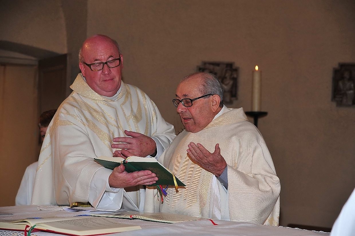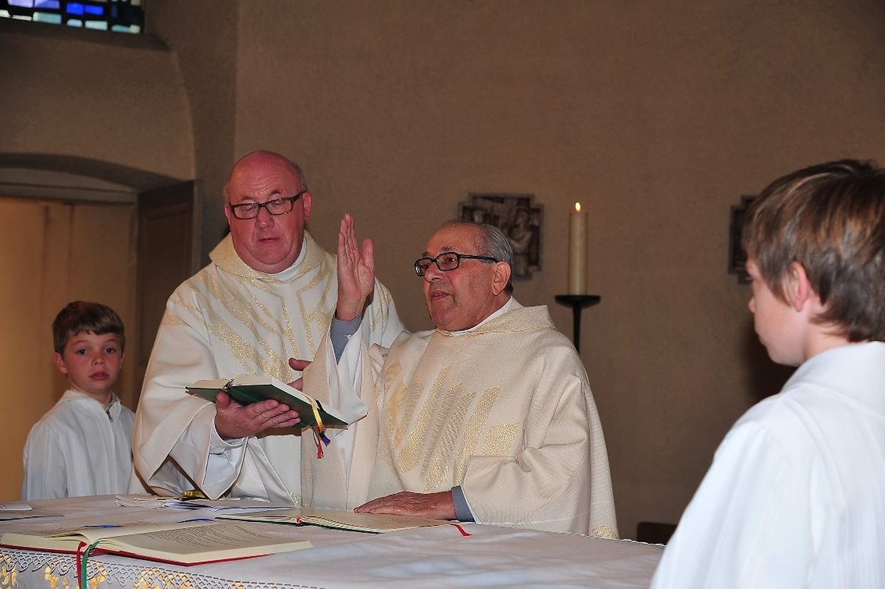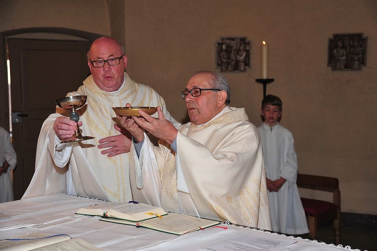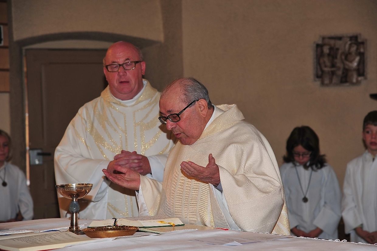 Die Mitglieder des Kirchenrates hatten zusammen mit Dechant Nico Jans zu dieser eindrucksvollen Feier eingeladen, zu der auch zahlreiche Ortsbewohner, Freunde, Vereinsmitglieder und Pfarrangehörige aus dem Pfarrverband Ospern der Einladung gefolgt waren. Die gesangliche Umrahmung der Eucharistiefeier hatten die Gesangvereine aus Ospern und Nagem unter der Leitung von Claude Reckinger mit Carlo Phillippe an der Orgel übernommen. Mit Pater Alfred Nothum konzelebrierte Dechant Nico Jans den Jubiläumsgottesdienst. In seiner Predigt ging Alfred Nothum auf sein 50- jähriges Wirken als Priester ein, wo er während 40 Jahren in Afrika verbrachte. In den Jahren 1953 bis 1968 studierte Pater Nothum in Rom und in Louvain um Priester und Missionar zu werden. Seit Februar 2009 lebt er im Kloster in Clairefontaine weil seine Gesundheit es ihm nicht mehr erlaubte nach Afrika zurückzukehren. An erster Stelle , so Nothum, muss ich Gott danken weil er mich dazu berufen hat Herz- Jesu- Priester und Missionar zu werden und dies im Dienste von allen Menschen und ebenfalls denjenigen in Afrika. Auch meiner Familie und euch allen von Nagem und aus den Nachbarpfarreien galt mein herzlicher Dank. Schon als Kind in Nagem habe ich meinen Beruf sehr früh entdeckt um in meinem späteren Leben, Priester zu werden und als Missionar in den Kongo zu gehen und es auch verstanden habe, dass wir nur glücklich und zufrieden werden können, wenn wir wie Jesus im Evangelium verkündete: Gott geben, was Gott gehört. Zum Schluss möchte ich den Herz- Jesu- Priester in Clairefontaine sowie den vielen Afrikaner für ihre Freundschaft sowie ihre Bereitschaft in den Pfarreien, Kommissionen und auf der Universität meinen aufrichtigen Dank aussprechen. Dechant Nico Jans seinerseits bedankte sich bei allen die dazu beitrugen, dass diese Jubiläumsfeier in Nagem zustande kam.
