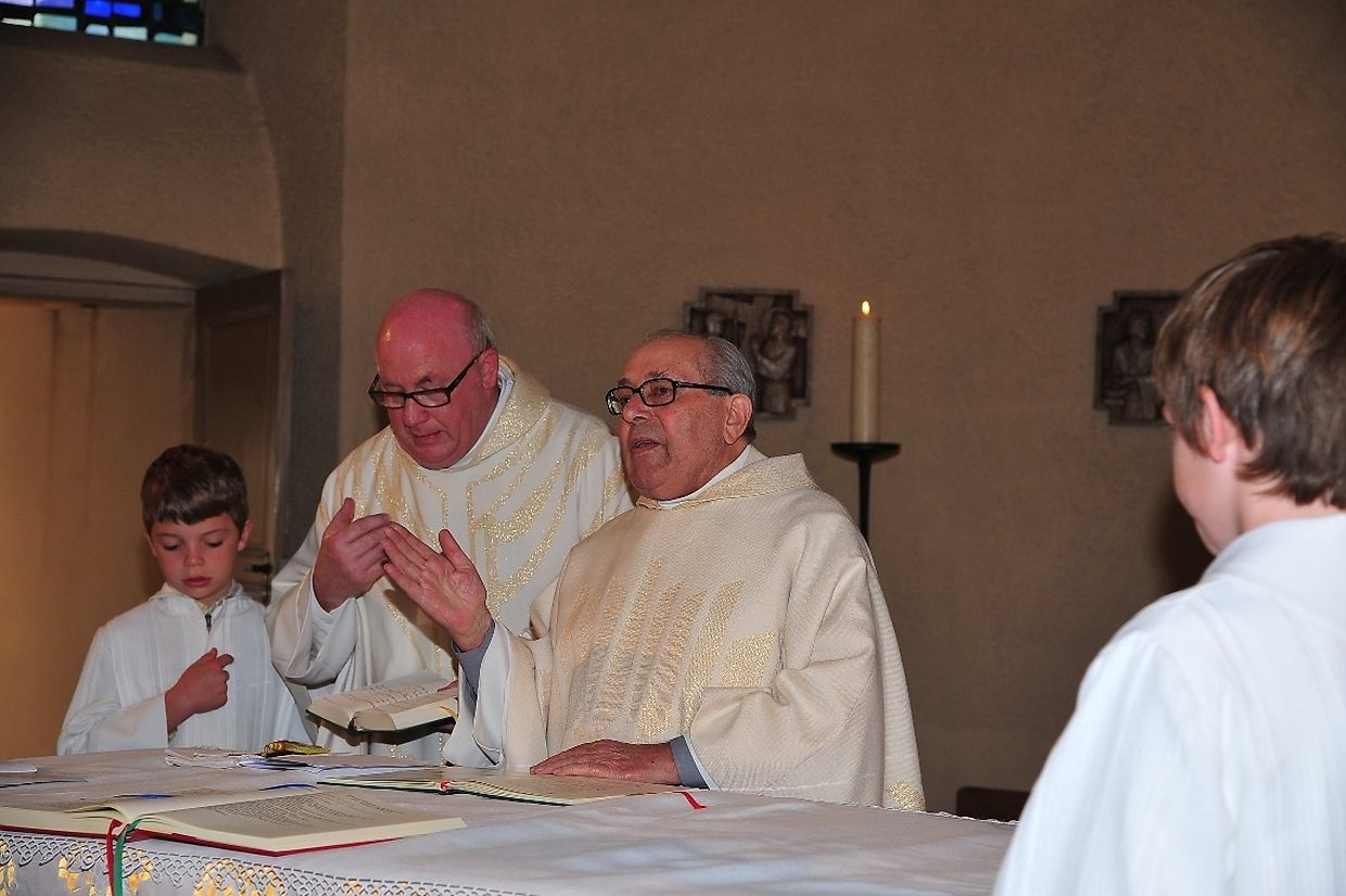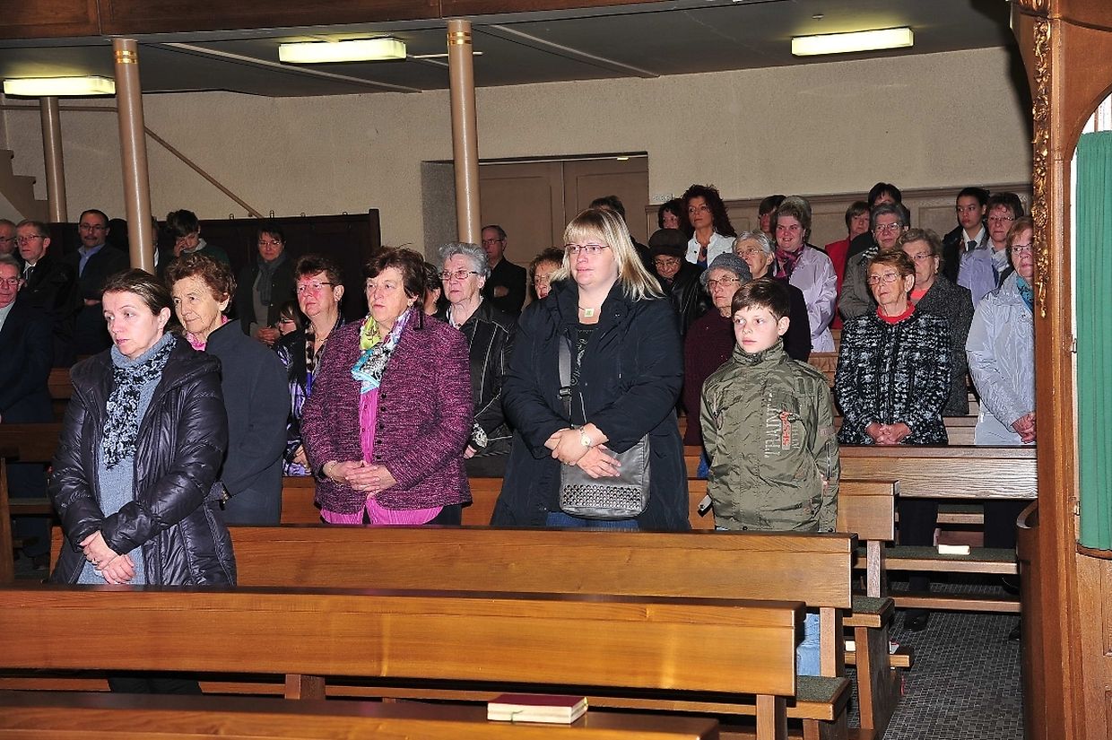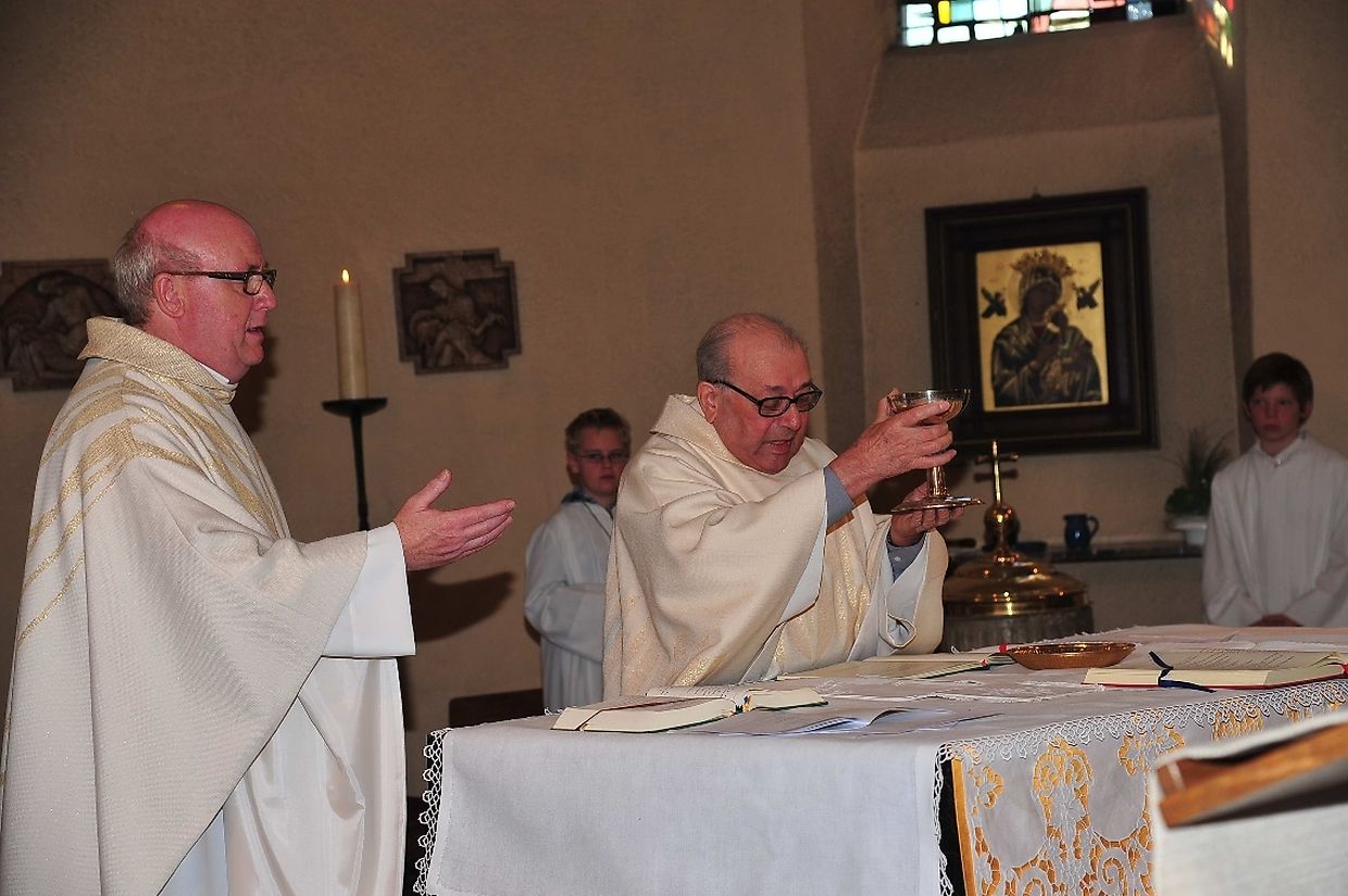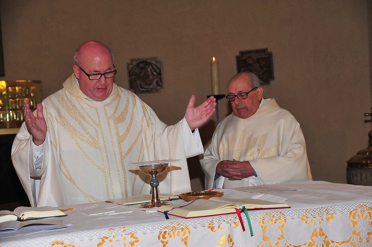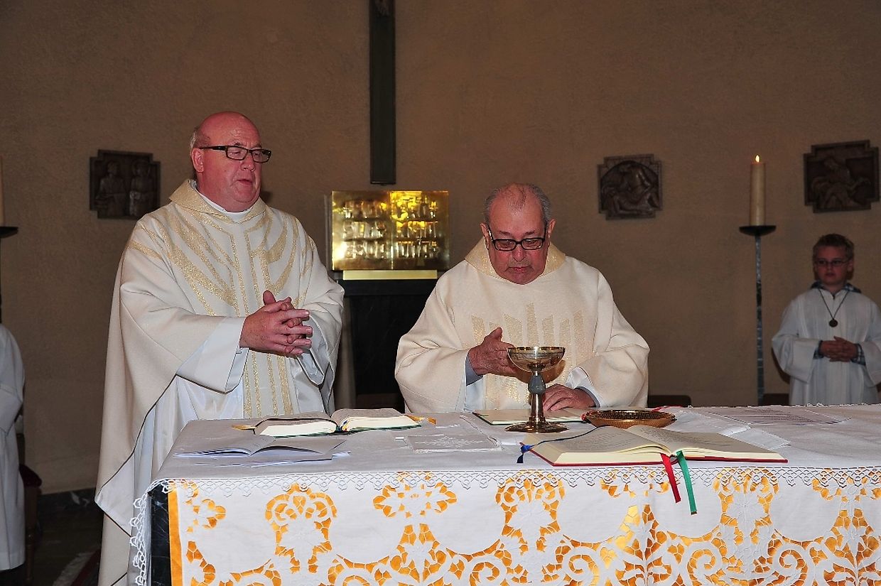 Die Mitglieder des Kirchenrates hatten zusammen mit Dechant Nico Jans zu dieser eindrucksvollen Feier eingeladen, zu der auch zahlreiche Ortsbewohner, Freunde, Vereinsmitglieder und Pfarrangehörige aus dem Pfarrverband Ospern der Einladung gefolgt waren. Die gesangliche Umrahmung der Eucharistiefeier hatten die Gesangvereine aus Ospern und Nagem unter der Leitung von Claude Reckinger mit Carlo Phillippe an der Orgel übernommen. Mit Pater Alfred Nothum konzelebrierte Dechant Nico Jans den Jubiläumsgottesdienst. In seiner Predigt ging Alfred Nothum auf sein 50- jähriges Wirken als Priester ein, wo er während 40 Jahren in Afrika verbrachte. In den Jahren 1953 bis 1968 studierte Pater Nothum in Rom und in Louvain um Priester und Missionar zu werden. Seit Februar 2009 lebt er im Kloster in Clairefontaine weil seine Gesundheit es ihm nicht mehr erlaubte nach Afrika zurückzukehren. An erster Stelle , so Nothum, muss ich Gott danken weil er mich dazu berufen hat Herz- Jesu- Priester und Missionar zu werden und dies im Dienste von allen Menschen und ebenfalls denjenigen in Afrika. Auch meiner Familie und euch allen von Nagem und aus den Nachbarpfarreien galt mein herzlicher Dank. Schon als Kind in Nagem habe ich meinen Beruf sehr früh entdeckt um in meinem späteren Leben, Priester zu werden und als Missionar in den Kongo zu gehen und es auch verstanden habe, dass wir nur glücklich und zufrieden werden können, wenn wir wie Jesus im Evangelium verkündete: Gott geben, was Gott gehört. Zum Schluss möchte ich den Herz- Jesu- Priester in Clairefontaine sowie den vielen Afrikaner für ihre Freundschaft sowie ihre Bereitschaft in den Pfarreien, Kommissionen und auf der Universität meinen aufrichtigen Dank aussprechen. Dechant Nico Jans seinerseits bedankte sich bei allen die dazu beitrugen, dass diese Jubiläumsfeier in Nagem zustande kam.