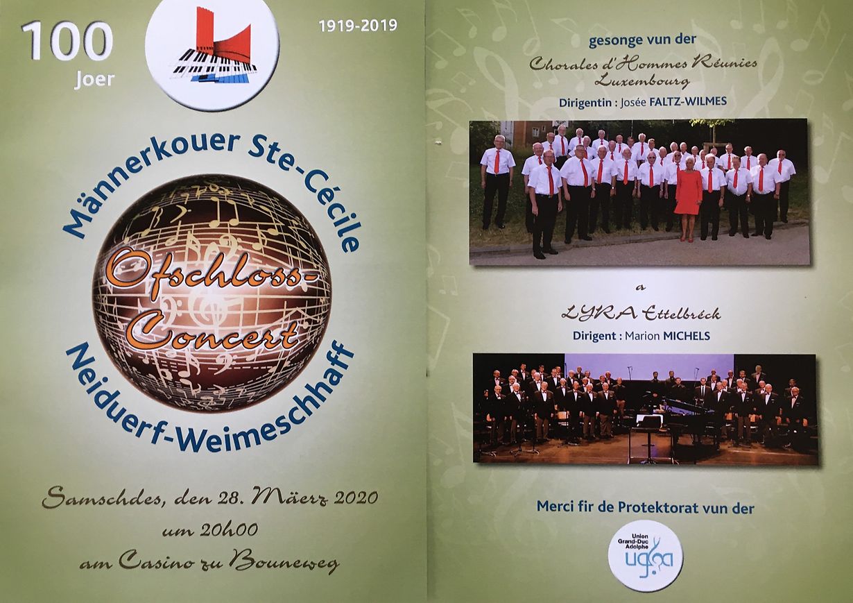 de Männerkouer Ste-Cécile Neiduerf-Weimeschhaff wäert Iech am Laf déi weider Informatiounen vun onsem Ofschluss-Concert vun onsem 100 jährigen Gebuertsdag weider ginn.