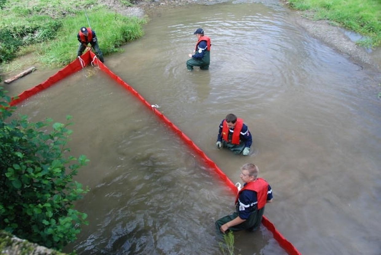 Und der Einsatzwagen vom Typ GWL2 hat so manches zu bieten: u. a. Leuchtballons, Abdichtpasten und -stopfen, Auffangbehälter und verlängerbare Sperren gehören zur Standardausrüstung. Mit Watthosen bekleidet steigen die Männer in den Bach hinunter. Eine Schwimmweste ist ebenfalls Pflicht, denn man kann nie wissen, wie tief das Gewässer am Einsatzort wirklich ist.
