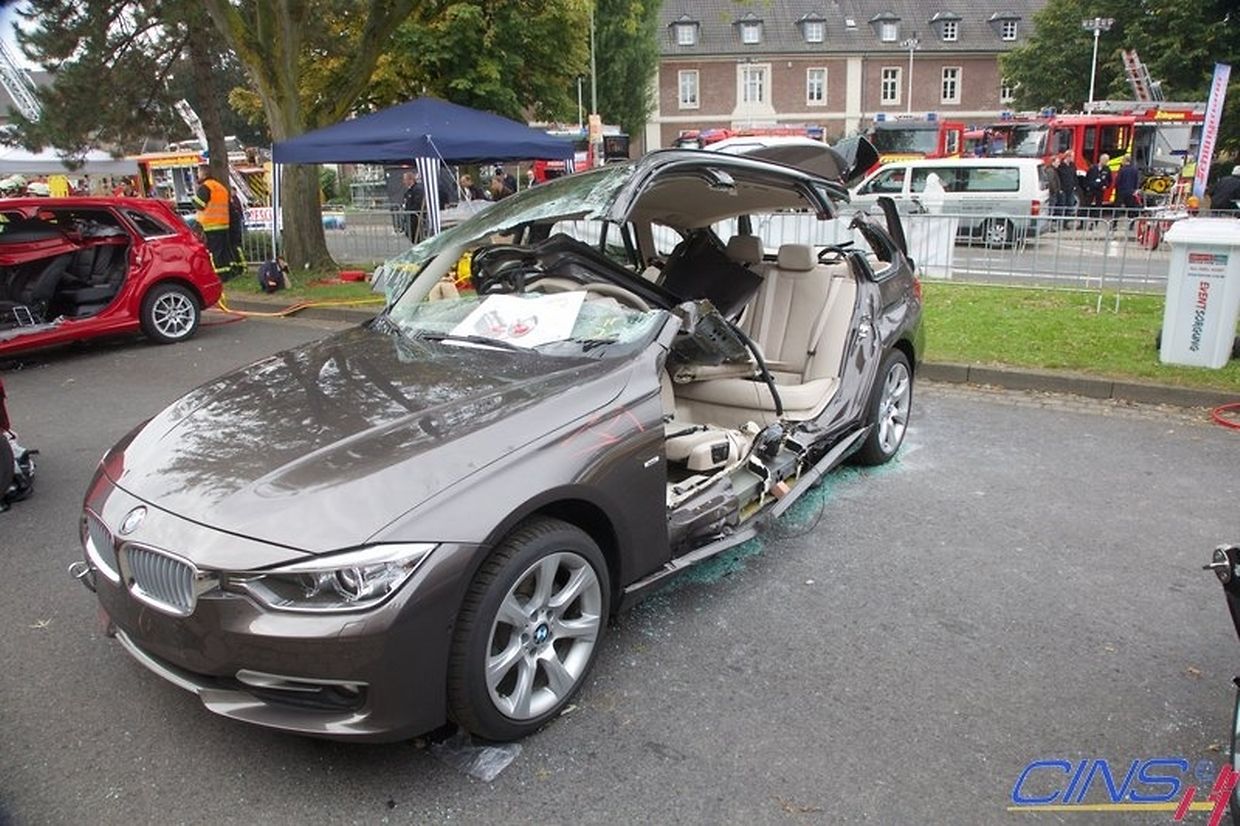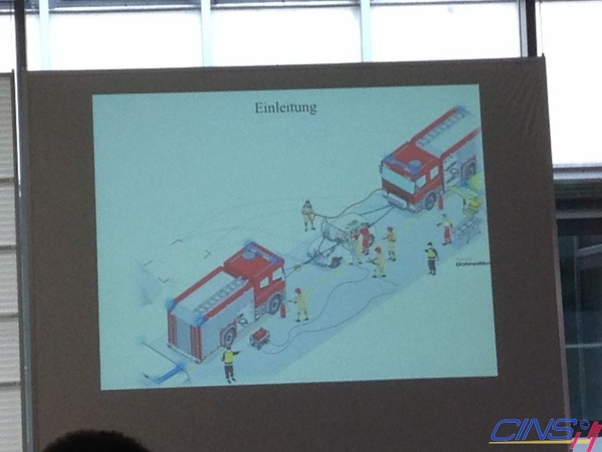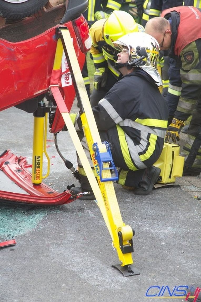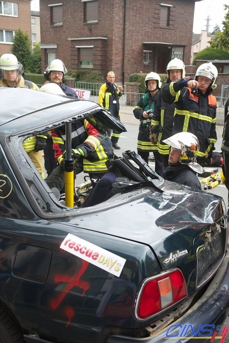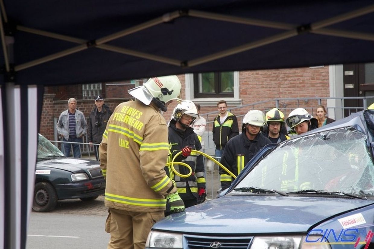 Gary Klaus ist Ausbilder und sagt im amerikanischen Akzent ist ,"Ich komme aus Cleveland, Ohio, und bin Feuerwehrmann". Er zeigt auf ein Auto, das tief unter einem LKW-Trailer eingequetscht ist. "Das ist unsere Station."Die "amerikanische" Station ist nur eine von insgesamt acht Szenarien, die auf dem Ostwall aufgebaut sind. Weitere Stationen sind "PKW in Seitenlage, PKW in Dachlage, Neue Fahrzeugtechnologien, Gerätzeeinsatz bei neuen Fahrzeugen, PKW seitlich gegen Baum und LKW-Rettung. Zudem ist jede Situation gleich dreifach vorhanden, so dass immer mehrere Gruppen gleichzeitig trainieren können. Gleichzeitig wurde auch ein Einsatzleiter Symposium organisiert, bei welchem der Schwerpunkt auf den Luftfahrzeugen lag.