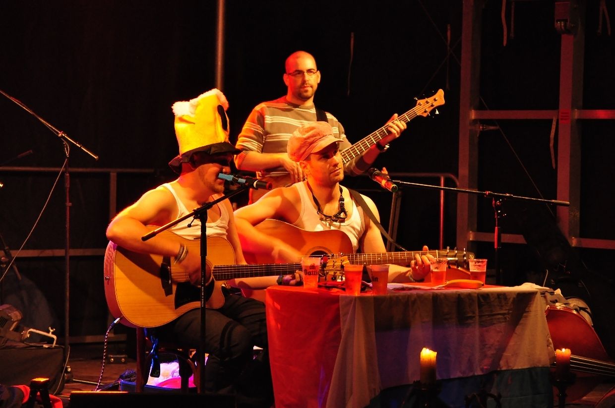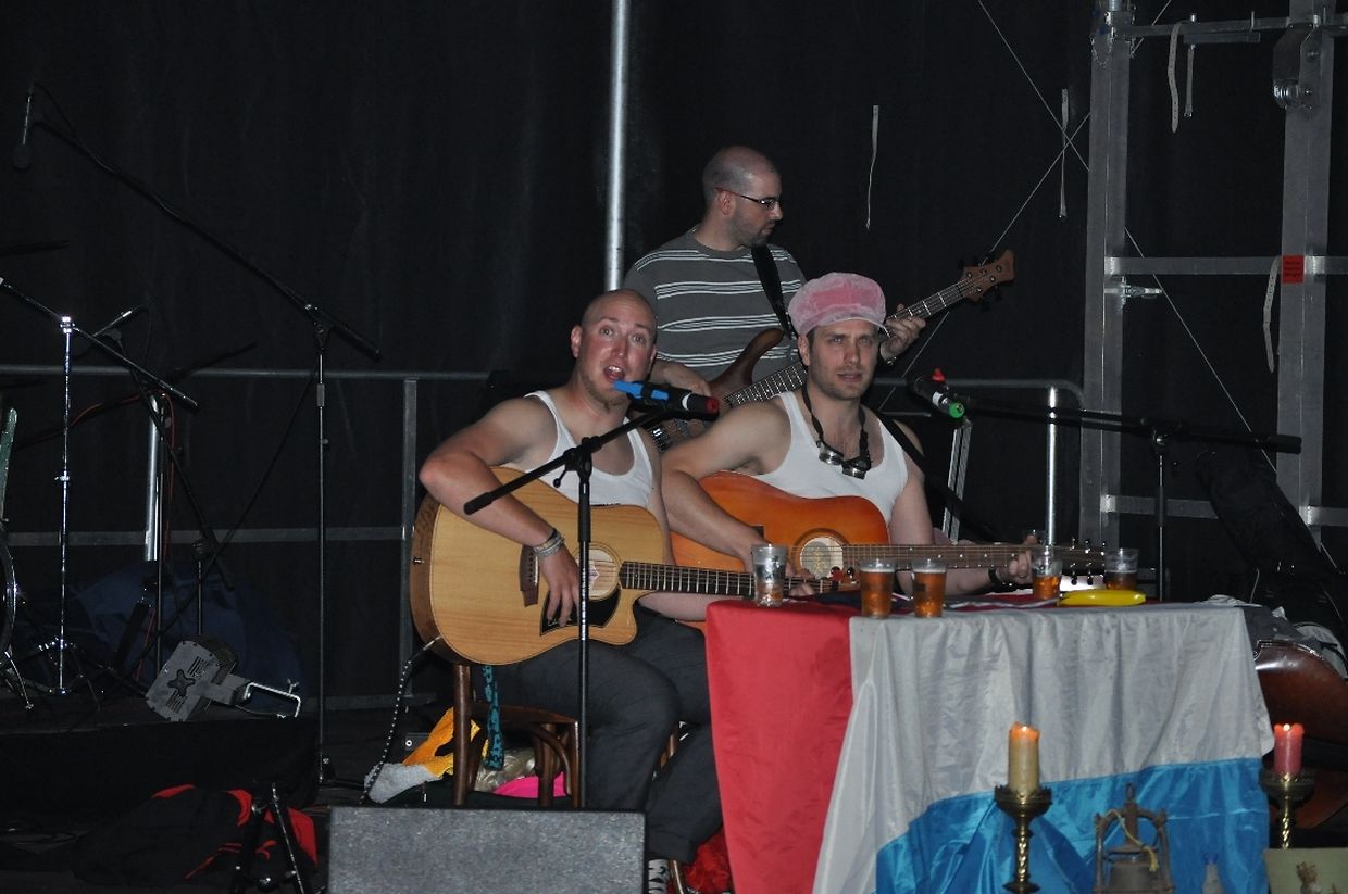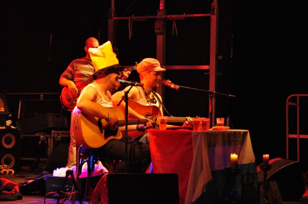 T'Dëppegéisser waren bei gudder Laun an hunn no enger klenger Stroumpann spontan de ganze Public op d'Bühn agelueden fir mat hinnen zesummen hier witzeg an och provokativ lëtzebuerger Texter ze sangen.