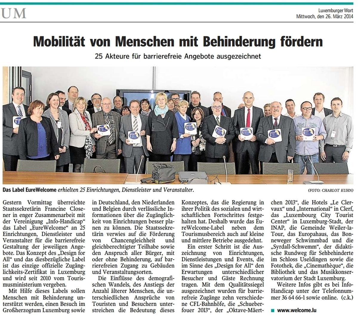 Gestern Vormittag überreichte Staatssekretärin Francine Closener in enger Zusammenarbeit mit der Vereinigung "Info-Handicap" das Label "EureWelcome" an 25 Einrichtungen, Dienstleister und Veranstalter für die barrierefreie Gestaltung der jeweiligen Angebote. Das Konzept des "Design for All" und das diesbezügliche Label ist das einzige offizielle Zugänglichkeits-Zertifikat in Luxemburg und wird seit 2010 vom Tourismusministerium vergeben.