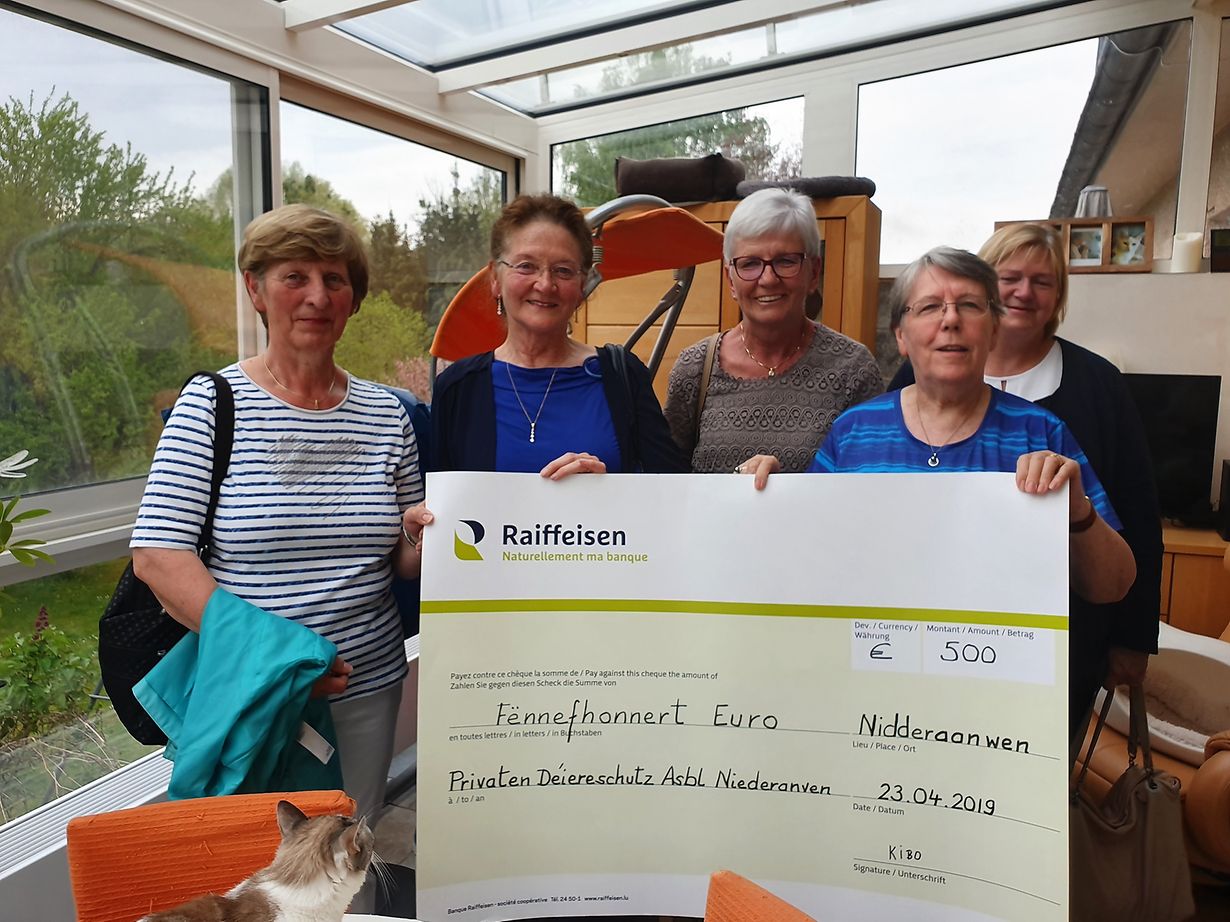 Niederanven Een Don fir de Privaten Déiereschutz asbl Marie-Anne Heinen-Mercy Published on Tuesday, 7 May, 2019 at 13:32 Niederanven, Luxemburg Déi 4 sympathesch Damen vun der Kierchebotz Sénneng an Hueschtert hun dem Privaten Déiereschutz asbl een Don vu 500 Euro iwerreecht. Mir soën hinnen ee ganz décke merci, eis vill Déiercher freeën sech iwer all Hëllef. Report inappropriate content More news by Marie-Anne Heinen-Mercy > Réckbléck op d'Joer 2024 vum Privaten Déiereschutz asbl 06/02/25 Niederanven Scheckiwerreechung vu beFIT Weiler-la-Tour 10/05/24 Weiler-La-Tour Generalversammlung beim Privaten Déiereschutz a.s.b.l. 10/05/24 Niederanven Tom a Jerry, 1-2 Joer 29/07/22 Niederanven Menni, Kueder vun 3 Joer 29/07/22 Niederanven