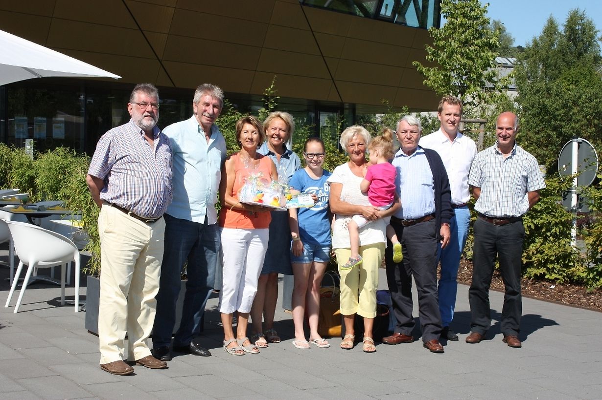 Annette Schleider aus Moutfort mit ihrer Familie und Freunden war überrascht und hat sich über die Glückwünsche und einen 250 € Gutschein sowie ein Geschenk gefreut. Annette Schleider besucht regelmäßig mit Familie, Freunden und Bekannten die Syrdall Schwemm und schätzt das familienfreundliche Ambiente.