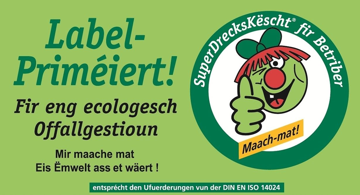 Gemeinsam mit dem Berater der „SuperDrecksKëscht fir Betriber“, einer gemeinsamen Aktion vom Ministerium für nachhaltige Entwicklung und Infrastrukturen, Chambre des Métiers und Chambre de Commerce, wurde das Konzept zur Abfallvermeidung und zur umweltgerechten Abfallwirtschaft erarbeitet. Nachdem die notwendige Infrastruktur eingerichtet und die Mitarbeiter informiert und eingewiesen wurden, konnte die Prüfung für den Erhalt des Qualitätslabels erfolgen.