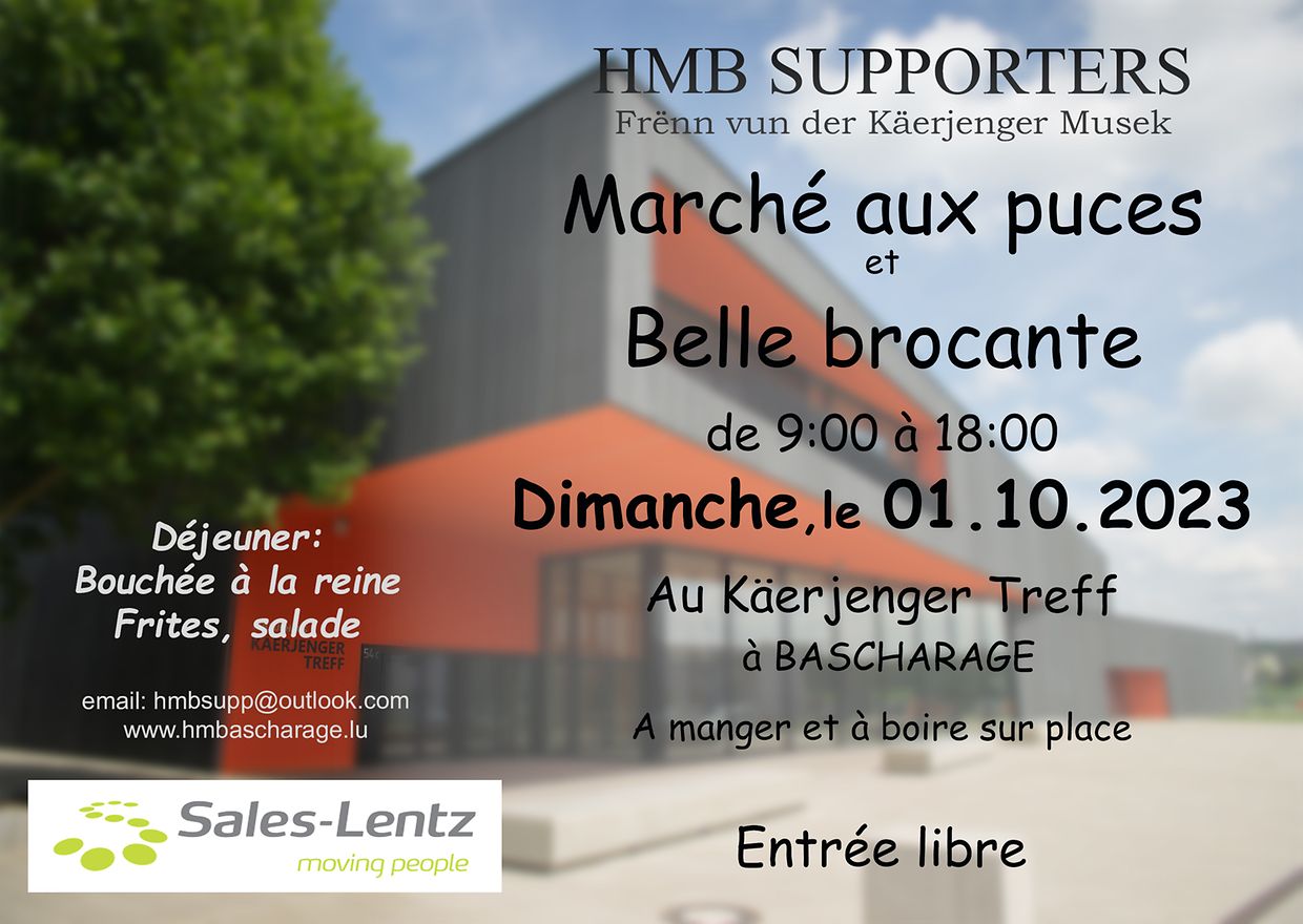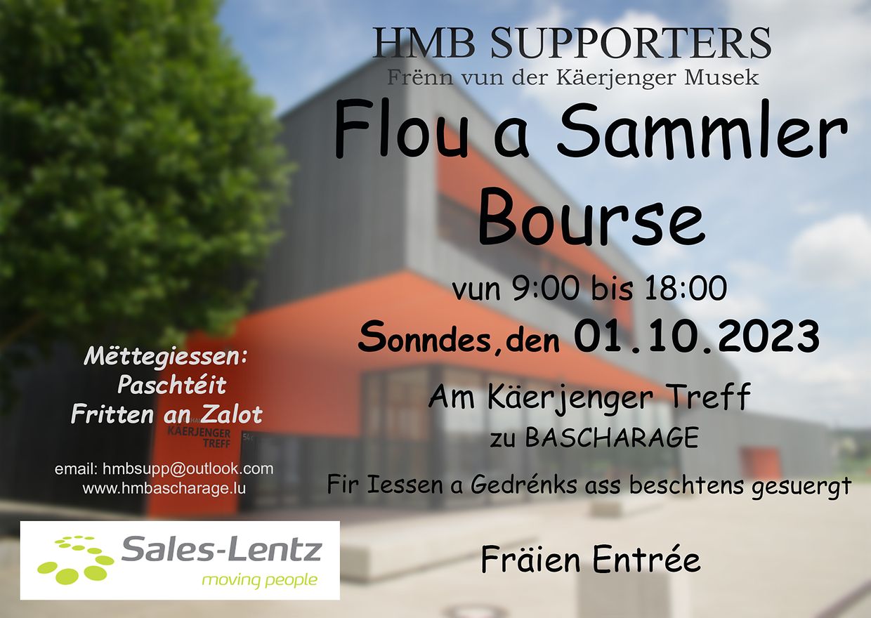 Bascharage Flou. a Sammlerbourse Christiane Noblet-Eickmann 2 Picture Gallery Please scroll down,to see more pictures. Published on Saturday, 23 September, 2023 at 13:53 Käerjeng, Luxemburg Flou- a Sammlermaart zu Käerjeng am Käerjenger Treff, organiséiert vun den HMB SUPPORTERS, Frënn vun der Käerjenger Musek. Sonndes den 01. Oktober 2023 vu 9:00 bis 18:00 Auer. Fräien Entrée. Info um Telefon 621263625. Et si keng fräi Plazen méi do. Report inappropriate content More news by Christiane Noblet-Eickmann > Flou.- a Sammlerbourse 20/09/24 Bascharage Flou. a Sammlerbourse 17/01/24 Bascharage Flou. a Sammlermaart 03/09/22 Bascharage