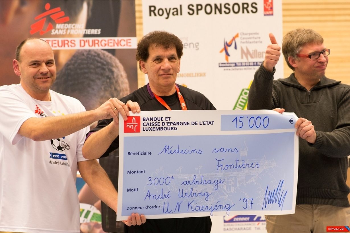 Am Kader vum 3000 Match als Arbiter, hunn den André URBING an den U.N. Käerjéng'97 zesummen ee Scheck un Médecins sans Frontières iwwerreecht. Merci all deene Leit déi een Don gemaach hunn fir den 3000 Match vum André URBING, dem Arbiter mat Häerz!