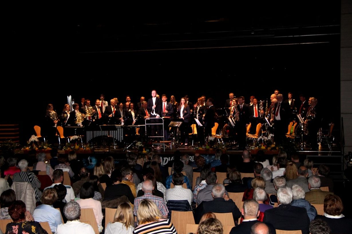 An engem gutt gefëllten Sall, huet de Raymond Kimmes duerch de Programm gefouert an den Alain Baustert hat d’Direktioun vum Orchester.