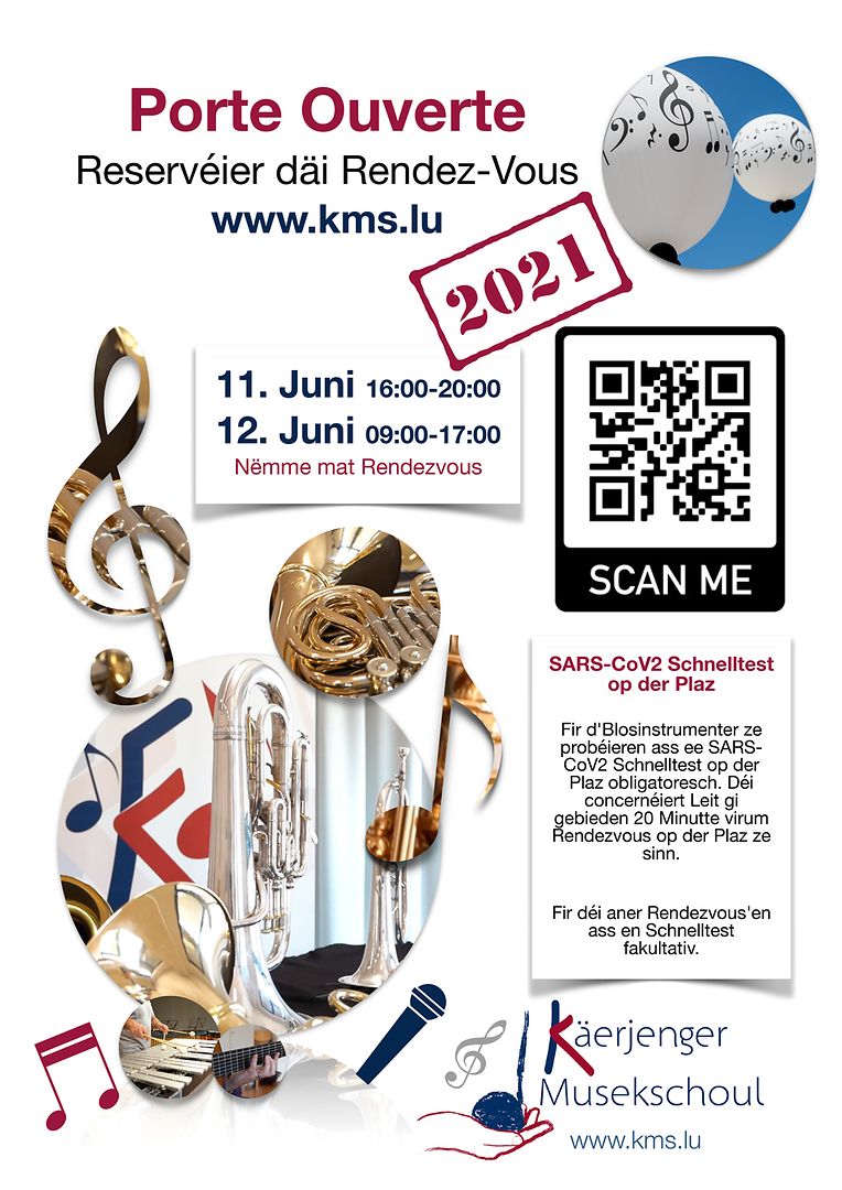 Och wann et dëst Joer leider keng Porte Ouverte am klassesche Sënn ka sinn, dierft dir awer Museksinstrumenter probéiere kommen. Allerdéngs geet dëst just op Rendezvous, deen dir iech ganz einfach iwwert den Internetsite www.kms.lu kënnt buchen. Fir Blosinstrumenter ze probéieren, ass en Covid-Schnelltest op der Plaz obligatoresch, deen natierlech gratis zur Verfügung gestallt gëtt. Déi Intresséiert sinn heifir gebieden 20 Minutte virun hirem Rendezvous schonn am Haff vun der Schoul ze sinn.