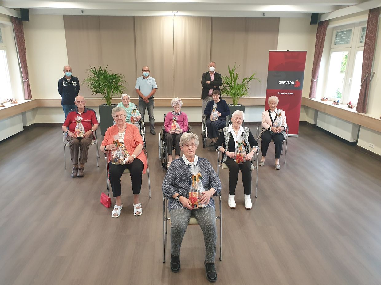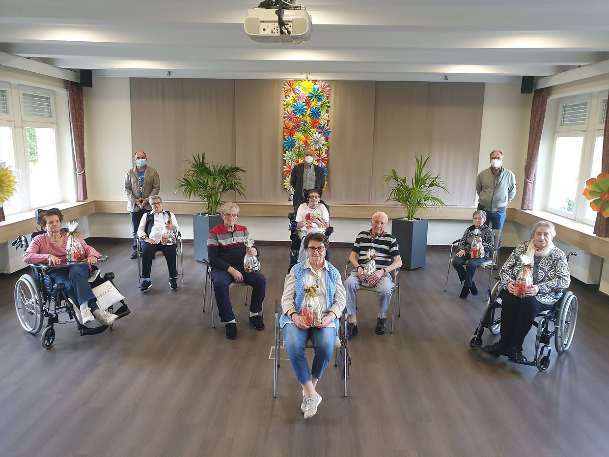 Bei dëser Receptioun huet d'Amicale vum Haus de Jubilaren e Kaddo iwwerreecht dee fir frou Gesiichter gesuergt huet.