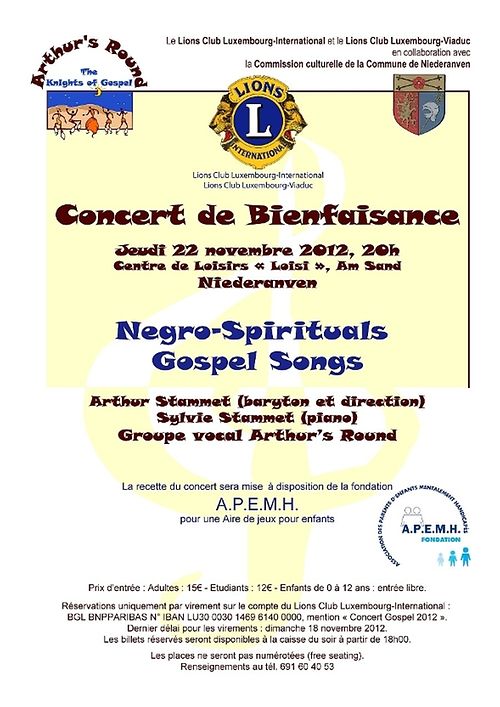 Prévente/réservation de tickets par virement sur le compte du Lions Club Luxembourg-International : BGL BNPPARIBAS N° IBAN LU30 0030 1469 6140 0000 mention "Concert Gospel 2012".