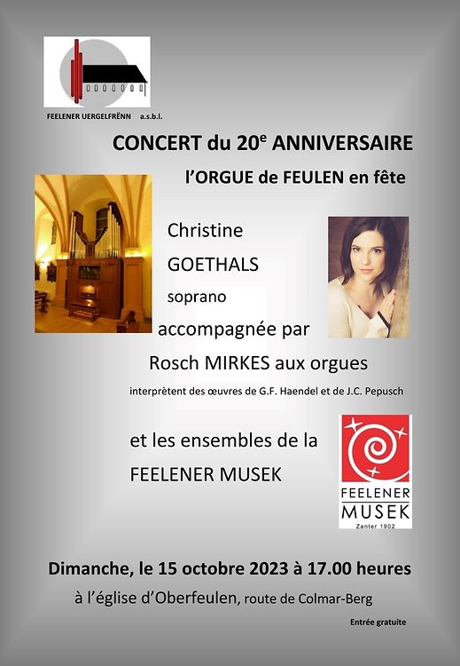 Invitation au concert avec Christine Goethals, soprano, accompagnée par Rosch Mirkes aux orgues et les ensembles de la Feelener Musek le 15 octobre à 17.00 heures é l'église à Oberfeulen route de Colmar-Berg