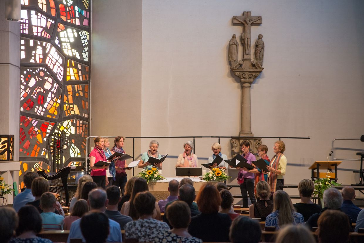 Rund um den Altar gruppiert beeindruckten die 10 Frauen von Viva la Musica durch virtuos vorgetragene à capella Stücke verschiedener Epochen und Stile. Von Kirchenmusik über mittelalterliche und klassische Werke bis hin zu volkstümlichen Weisen aus ihrer Heimat spannte die Chorleiterin, Lisbeth Hellerschmid, die selbst mitsang, den Bogen ihres Repertoires.