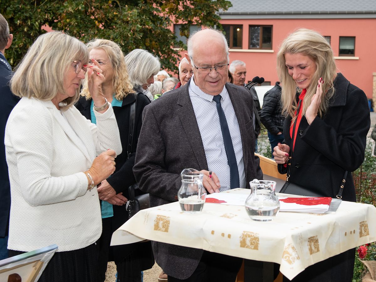 No der Aweiung vun der Roseraie, an där nieft villen aneren interessanten Zorten nun och 20 „CaraMia“-Rousen hiert neit Doheem fonnt hunn, huet de Buergermeeschter op een Éierewäin invitéiert an huet och net laang fléiwe mussen.
