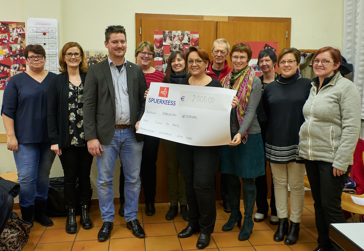 Ein Scheck über 2.000 € aus dem Erlös des Konzertes „Songs for Charity“ konnte während der Generalversammlung an die Verantwortlichen von Parkinson Luxemburg, Heidi Neises und Thierry Lentz überreicht werden.