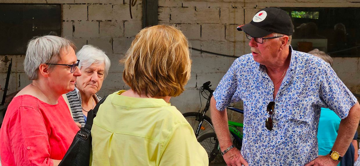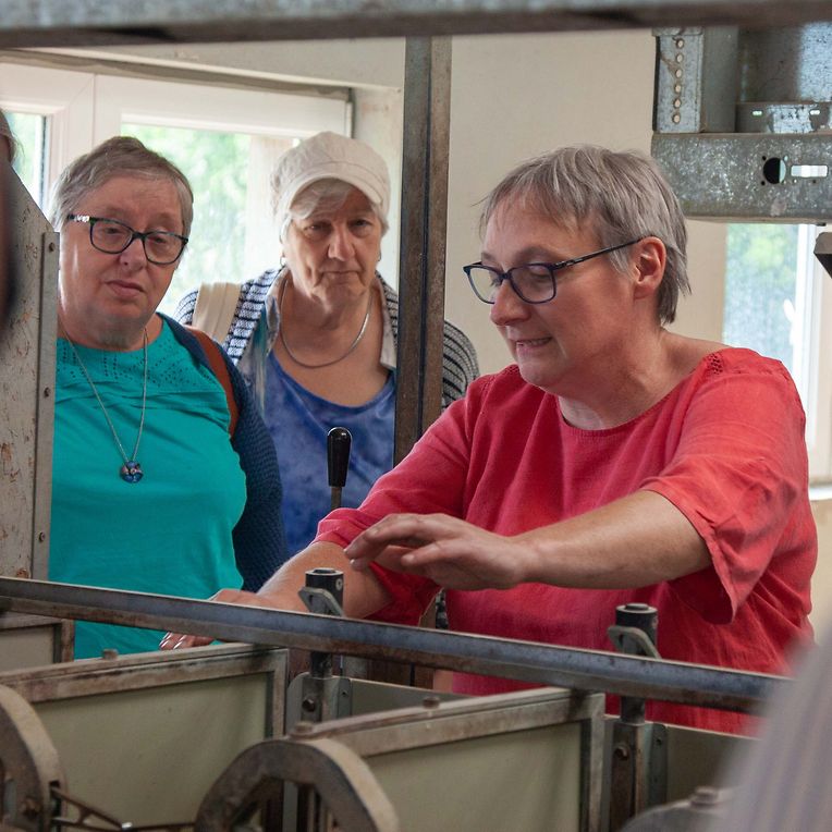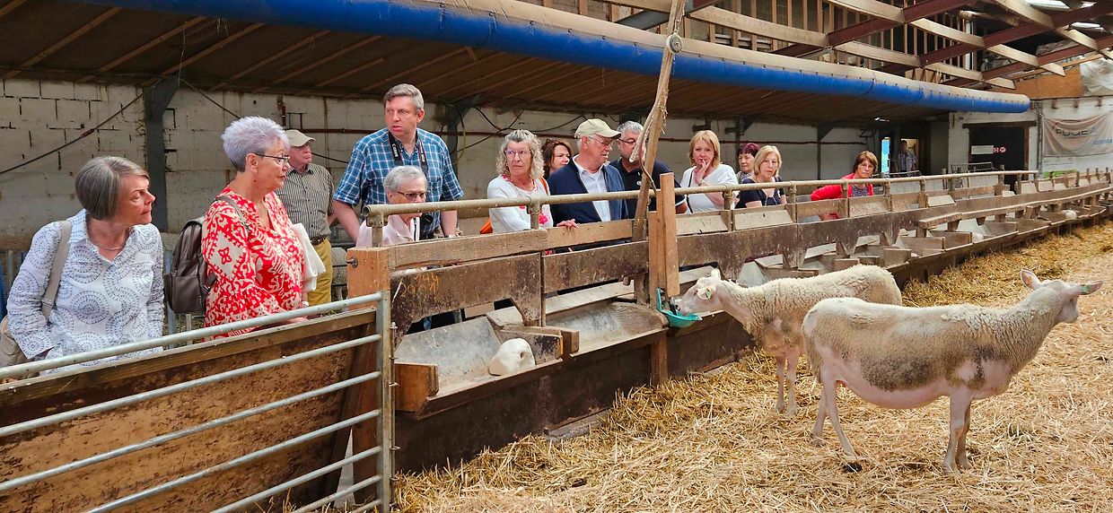 Gebannt lauschen zwei Dutzend Mitglieder des "Gaart an Heem Uewerkäerjeng" den einleitenden Worten der Schäferin, Barbara De Cock Vissenaekens, welche die Gäste nur wenig später zum gemeinsamen Frühstück in ihrer gemütlichen Stube empfängt. Die Besucher führt sie anschließend in den Stall, zu den belgischen Milchschafen. Wissensdurstig horchen jene auf und lassen sich in die Geheimnisse der Schafzucht einweihen, ganz hingerissen. Darauf folgend bietet Peter persönlich - diplomierter Käsemeister – Probierhäppchen, sowie frische Produkte aus eigener Herstellung, zum Erwerb an.