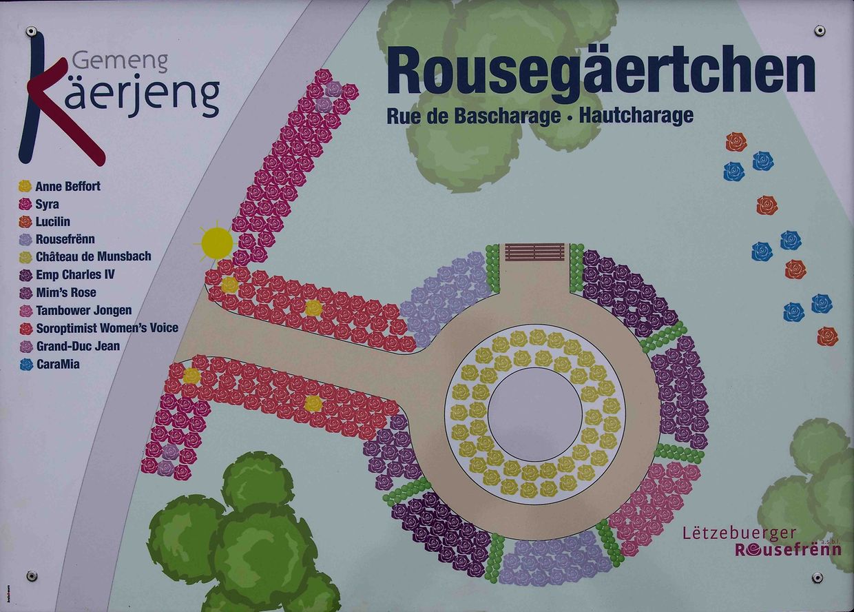 Hier bietet sich ein Besuch des frisch angelegten und erst kürzlich eingeweihten Rosengartens an. Neben einer Vielfalt an fabelhaften Rosen verzückt ganz besonders die farbenfrohe "CaraMia". An ebendieser Stelle ist sie erst im September vom "Gaart an Heem Uewerkäerjeng" aus der Taufe gehoben worden und kann immer noch in dessen Sekretariat (Nummer 661 / 271 070) erworben werden.
