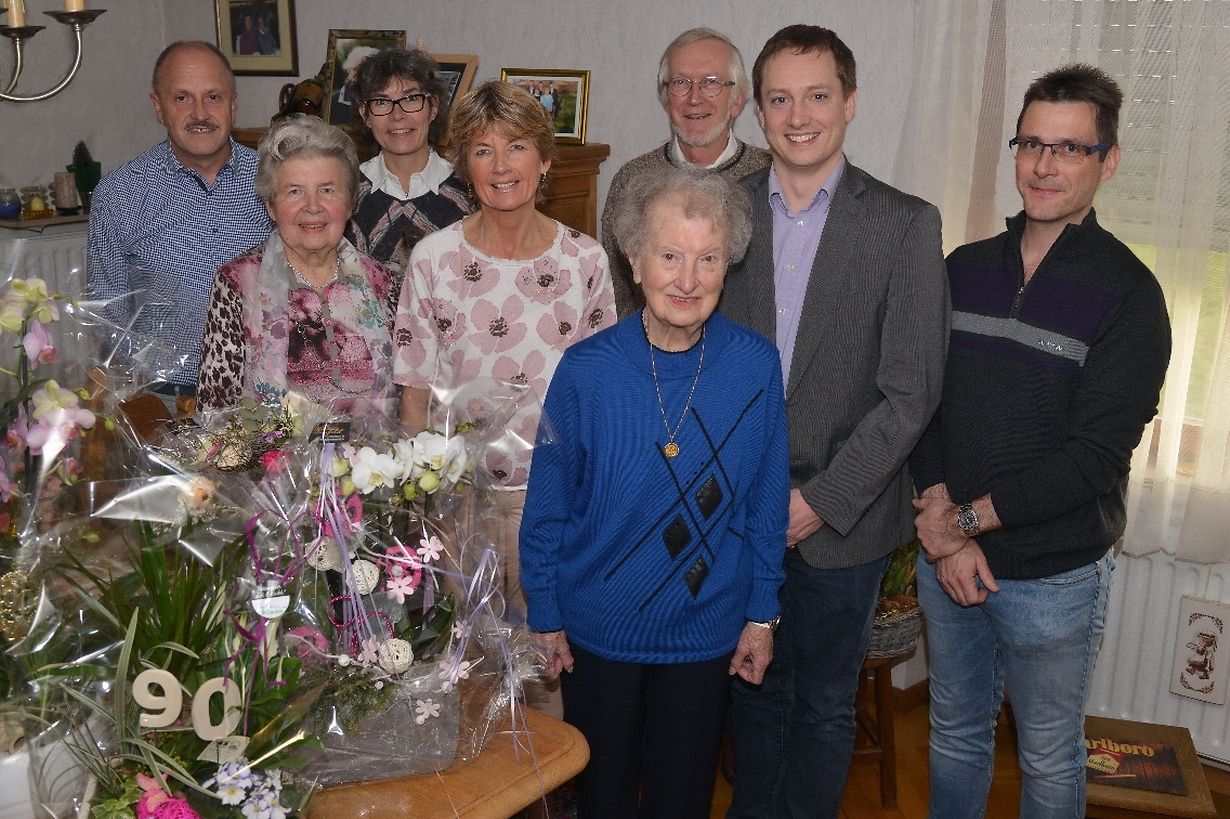Oberpallen: Mit einem Geschenkkorb und Pralinen überraschten neulich Bürgermeister Thierry Lagoda mit Schöffe Patrick Wampach an seiner Seite, Agnès Thilmany aus Oberpallen um dem Geburtstagskind die Glückwünsche der Gemeinde Beckerich zum 90. Wiegenfest zu übermitteln. Agnès Thilmany wurde am 15. März 1927 als zweitjüngste Tochter von vier Kindern in Oberpallen geboren. In ihrer aktiven Berufszeit betrieb die Jubilarin neben einer Gastwirtschaft, eine Tankstelle und war ebenfalls in einem Lebensmittelladen in Oberpallen bis zu ihrem Ruhestand beschäftigt. Zu den Gratulanten gehörten ebenso ihre Familie die mit der Überreichung von schönen Blumen die allerbesten Glückwünsche entgegenbrachten, wofür sich die Geehrte auch herzlich bedankte. (FOTO: CHARLES REISER)