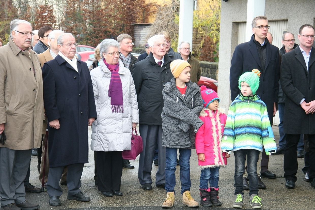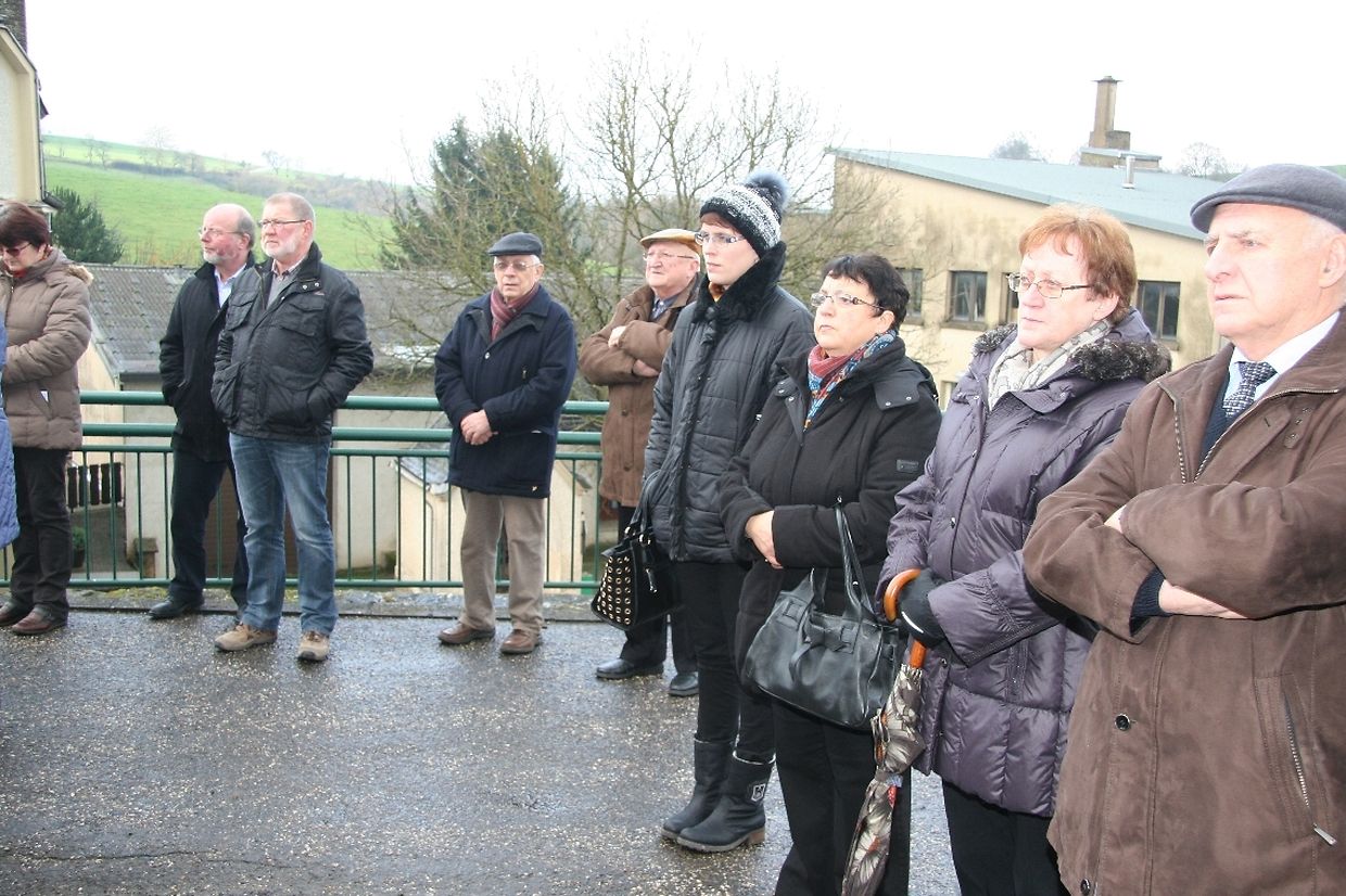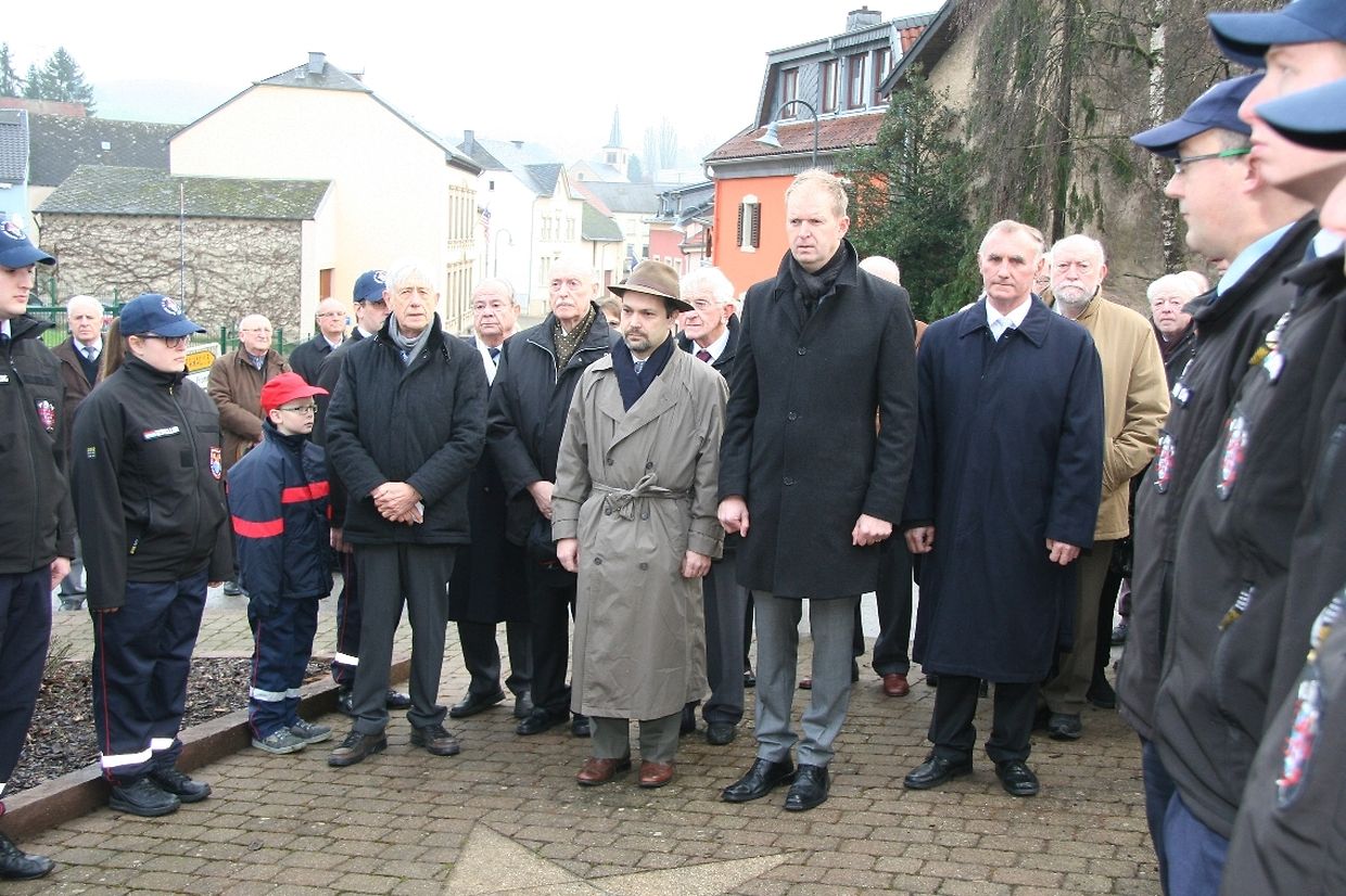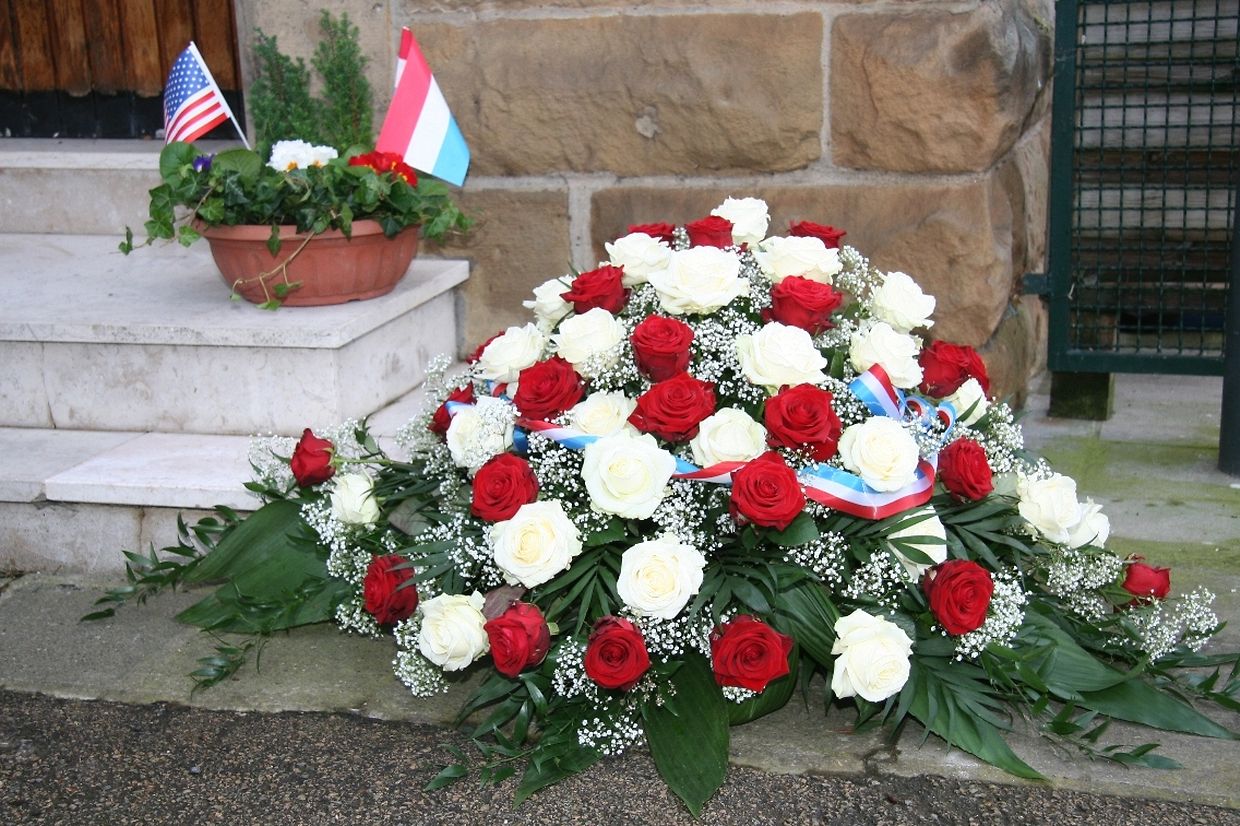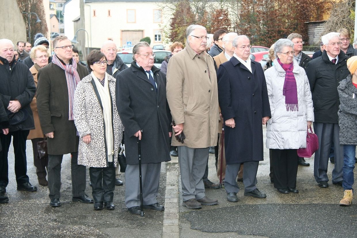 Nach dem Gottesdienst begaben sich die Anwesenden, unter ihnen die Ostdeputierten Octavie Modert und Léon Gloden, zur Gedenktafel an der Schule. Dort legten die Schöffenratsmitglieder zusammen mit dem Botschaftsvertreter sowie Marcel Dondelinger als Vertreter der Reserveoffiziere zu den Klängen der „Sonnerie aux Morts“ Blumen nieder.