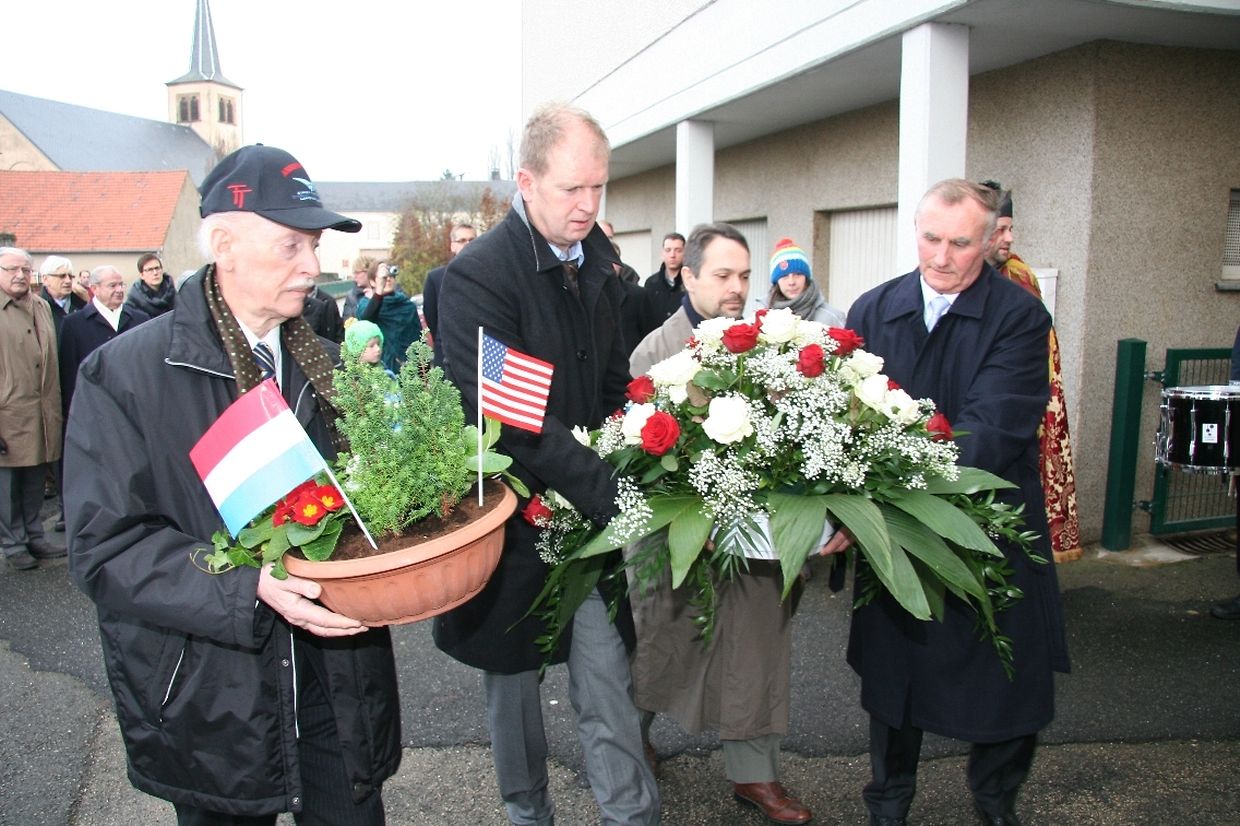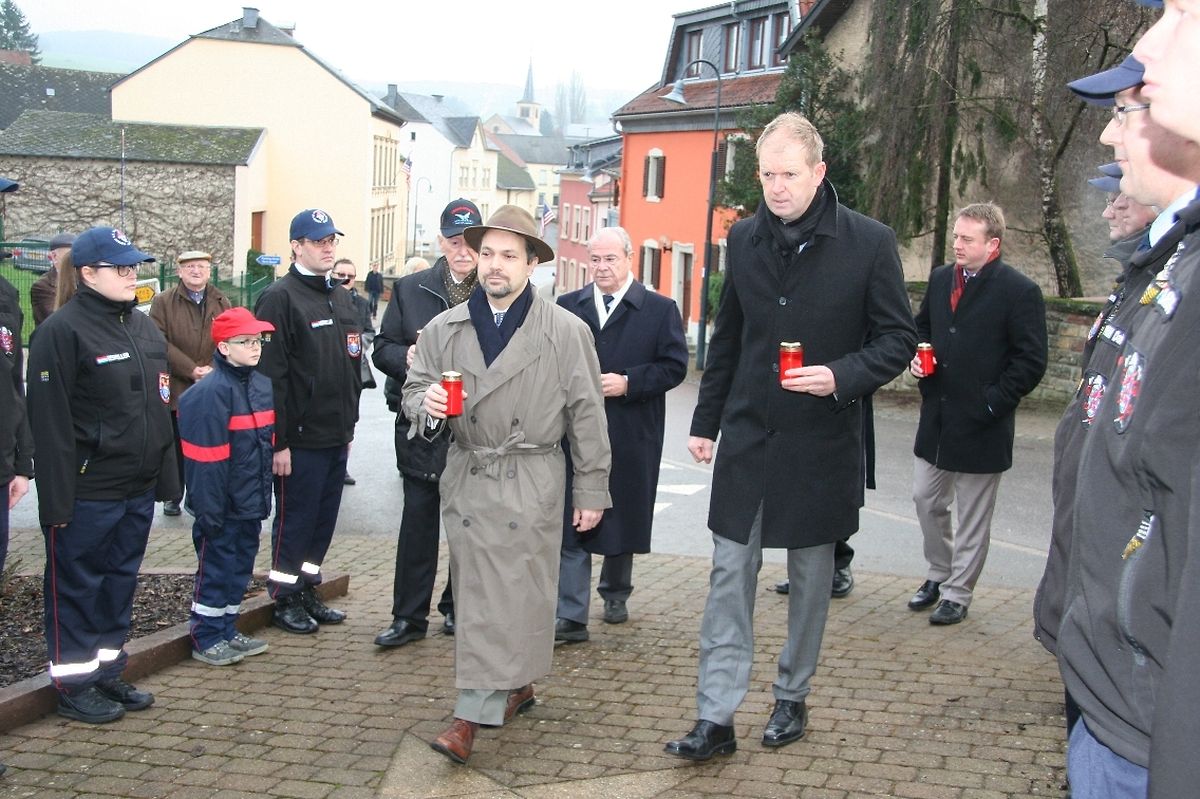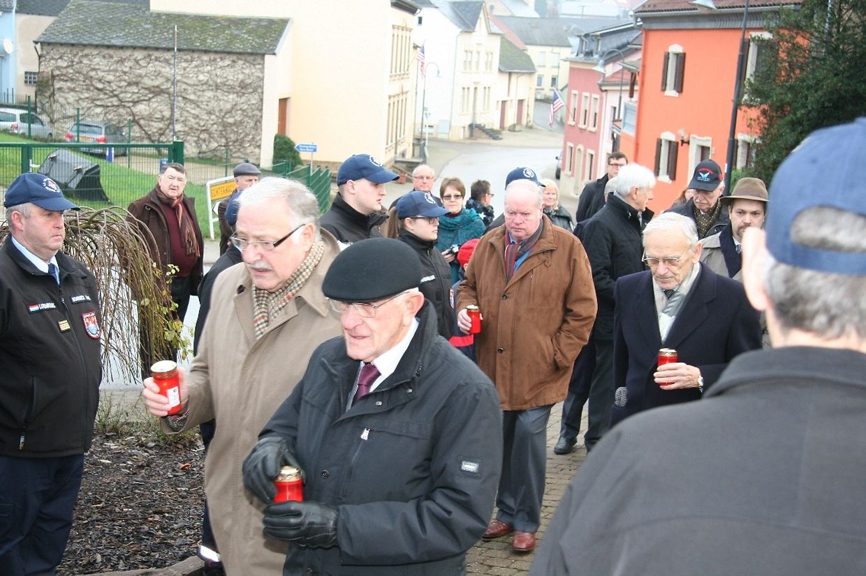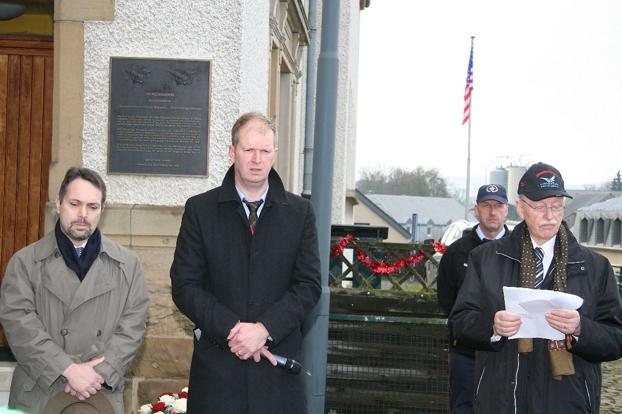 So fanden die Reserveoffiziere sich auch wieder am Sonntag, den 14. Dezember um 10 Uhr am Memorial an der Abzweigung zum Fromburgerhof ein. Dort zündeten sie in Anwesenheit von Lawrence J. Fields, dem Vertreter des US-Botschafters in Luxemburg, Kerzen an als Ehererbietung für alle amerikanischen Soldaten, die ihr Leben im Kampf für die Freiheit unseres Landes in der Region um Osweiler verloren oder Schaden an Leib und Seele erlitten.