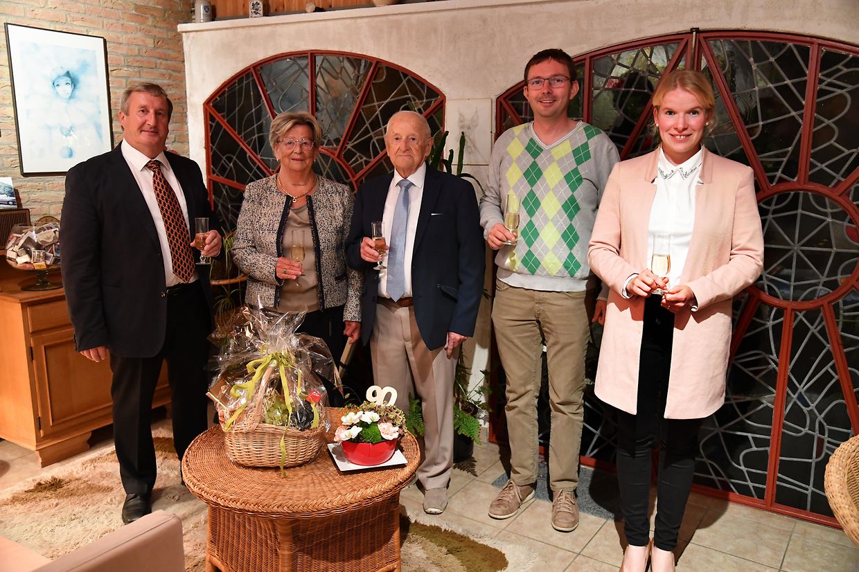 Perlé: Bei guter Gesundheit und stets gut gelaunt, konnte Jos Heinen aus Perlé sein 90. Wiegenfest feiern. Zu diesem Anlass war Bürgermeister Toni Rodesch in Begleitung seiner beiden Schöffen Myriam Binck und Mike Bolmer mit einem Geschenkkorb beim Jubilar vorstellig, um Jos Heinen die allerbesten Glückwünsche seitens der Gemeindeverwaltung Rambrouch übermitteln zu dürfen. Jos Heinen erblickte das Licht der Welt am 29. September 1930 in Perlé als ältester Sohn von zwei Kindern, der aus Bondorf stammenden Eheleute Constant Heinen und Maria Wampach. Nach der Heirat zogen die Eltern des Jubilars nach Perlé. Jos Heinen, der über mehrere Meisterprüfungen verfügte, machte sich in seiner beruflichen Laufbahn zuerst als Elektriker selbstständig und wechselte später zu einem Unternehmen das im Bereich der Wärmepumpen und Heizungen spezialisiert war. Seit 1990 genießt das Geburtstagskind seinen wohlverdienten Ruhestand. Als Musikant bei der lokalen Musikgesellschaft und als Präsident des einheimischen Fußballvereines war seine Freizeit stets gut mit abwechslungsreichen Vereinsaktivitäten gefüllt. Die Heirat mit Francine Lux aus Perlé fand am 7. September 1957 statt, die in ihrem Dorfladen die vielen Kunden von 1952 bis 2002 zur besten Zufriedenheit stets gut bediente. Dann wurde das Glas erhoben und auf weitere zufriedene und gesunde Jahre geprostet. (TEXT/FOTO: CHARLES REISER)