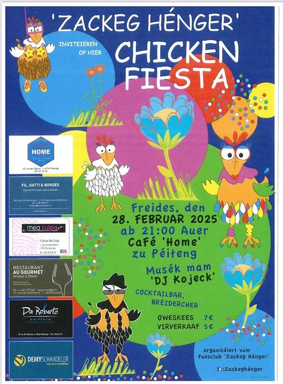 Pétange Chicken Fiesta 2026 vun den Zackegen Henger Alain Gantrel Published on Thursday, 15 January, 2026 at 11:57 Petingen, Luxemburg Den 13. Februar ass et erem esou weit: Chicken Fiesta vun den Zackegen Henger am café am Home, 52, rue de l'église zu Peiteng Ufank: 21 Auer Report inappropriate content