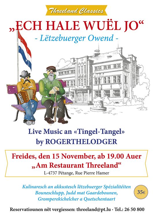 Pétange Letzebuerger Owend Marco Putz Published on Tuesday, 10 October, 2017 at 14:57 Petingen, Luxemburg Flotten letzebuerger Owend mat Danzmusik Iessen mat letzebuerger Spezialitäten Animatioun vum Bour Rosch am Restaurant Threeland Hotel Report inappropriate content More news by Marco Putz > Großzügige Unterstützung für den Tennisverein Petingen 12/03/23 Pétange The dansant le 17 novembre 2019 Entrée gratuite 14/02/17 Pétange THE DANSANT fraien Entreee all Sonnden zou Peténg 26/11/13 Pétange ATP ROLLER CHALLENGER TENNIS TOURNAMENT 75.000 € A PETANGE 01/06/13 Pétange The dansant tous les dimanches à Pétange avec orchestre 12/12/11 Pétange