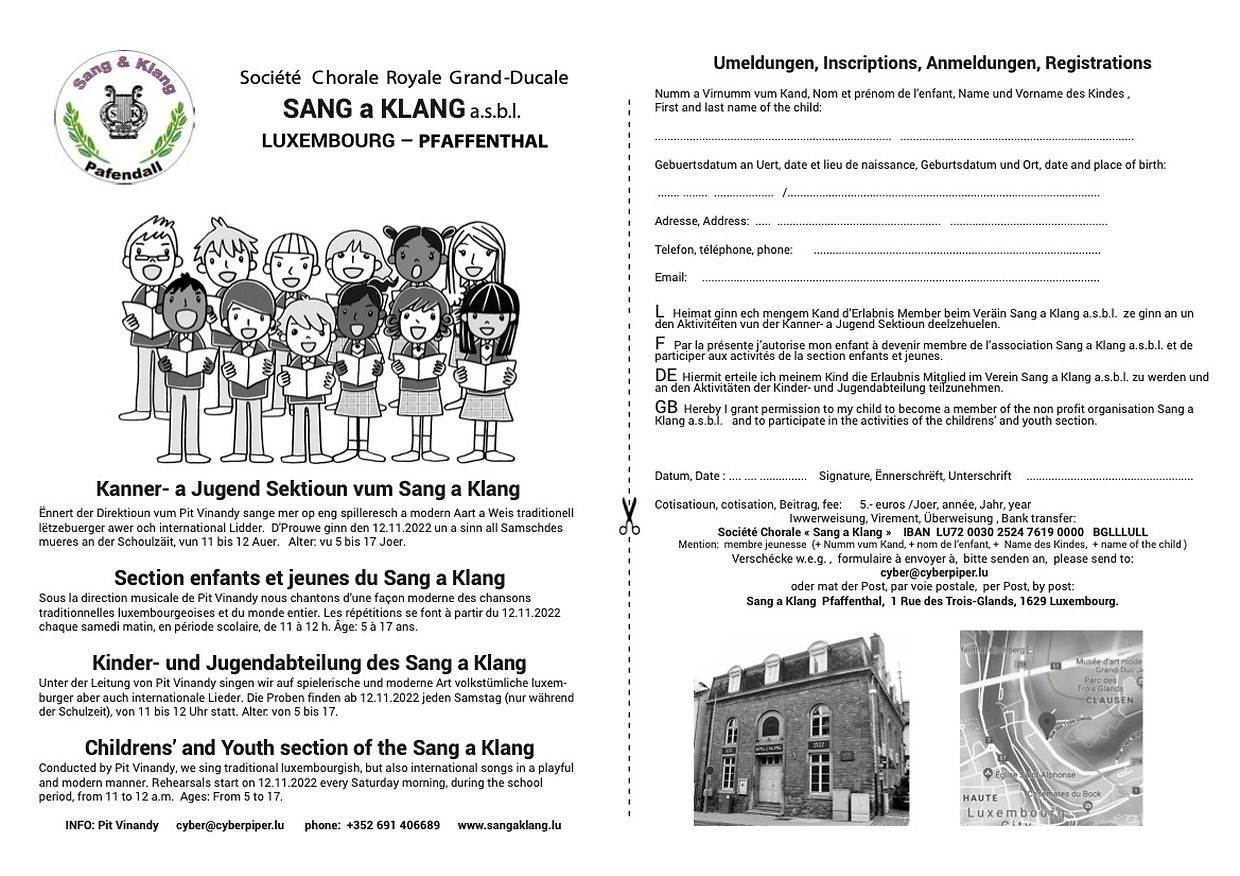 Sous la direction musicale de Pit Vinandy nous chantons d’une façon moderne des chansons tradition-nelles luxembourgeoises et du monde entier. Les répétitions se font à partir du 12.11.2022 chaque samedi matin, en période scolaire, de 11 à 12 h. Âge: 5 à 17 ans.