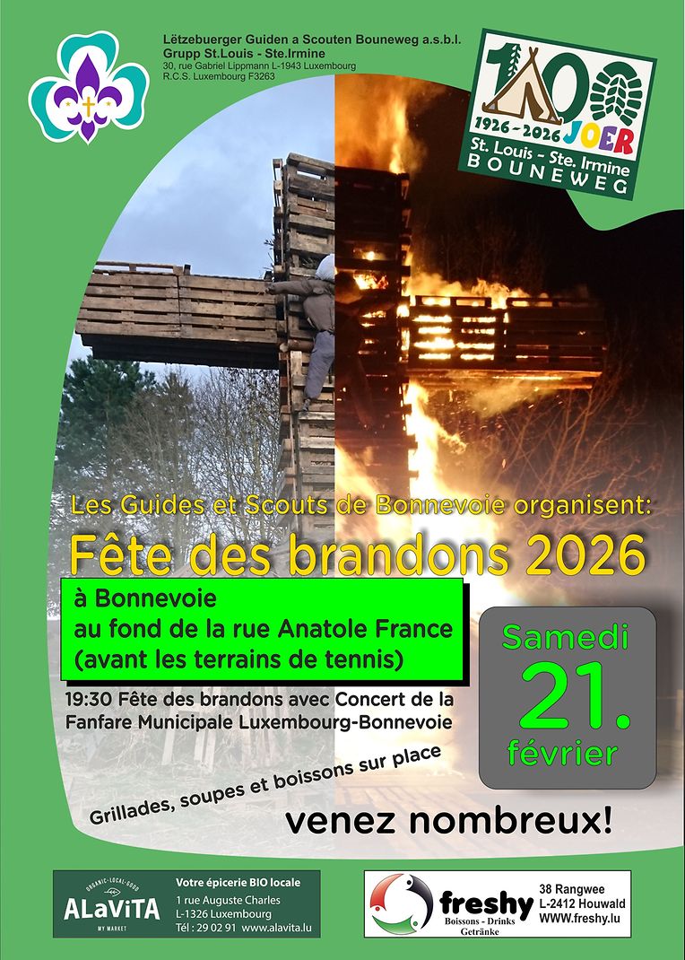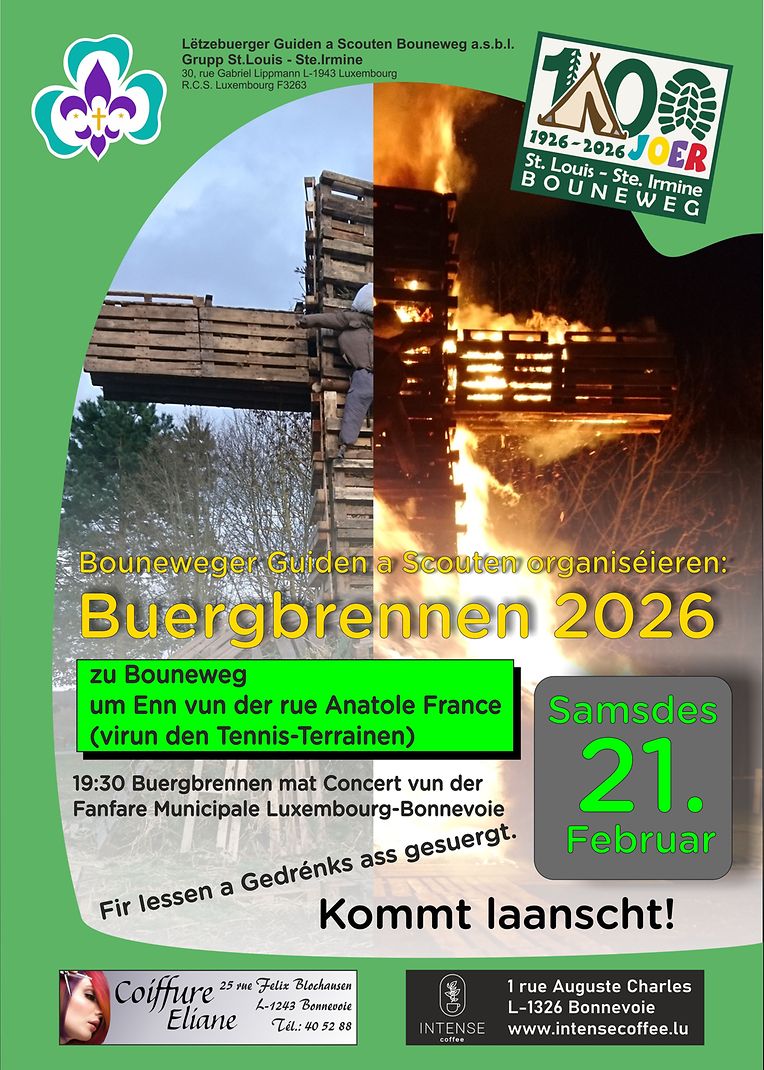 Leider kënne mir d'Buergbrennen dëst Joer net um Kaltreis beim Waassertuerm maachen, wou mir d'Buerg 29 Joer laang gebrannt hunn, well mir vun der Gemeng keng Erlabnis op där Platz kruten. Dofir maache mir d'Buergbrennen dëst Joer hannen an der rue Anatole France.