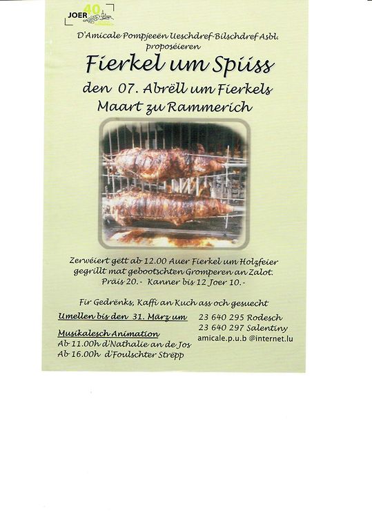 D'Amicale Pompjeeën Ueschdref Bilschdref proposéieren Iech um Fierkelsmaart zu Rammerich Fierkel um Spiiss um Holzfeier, gegrillt mat gebotschten Gromperen an Zalot .Zervéiert gëtt ab 12.00 Auer.Fir Kaffi an Kuch ass och gesuergt.