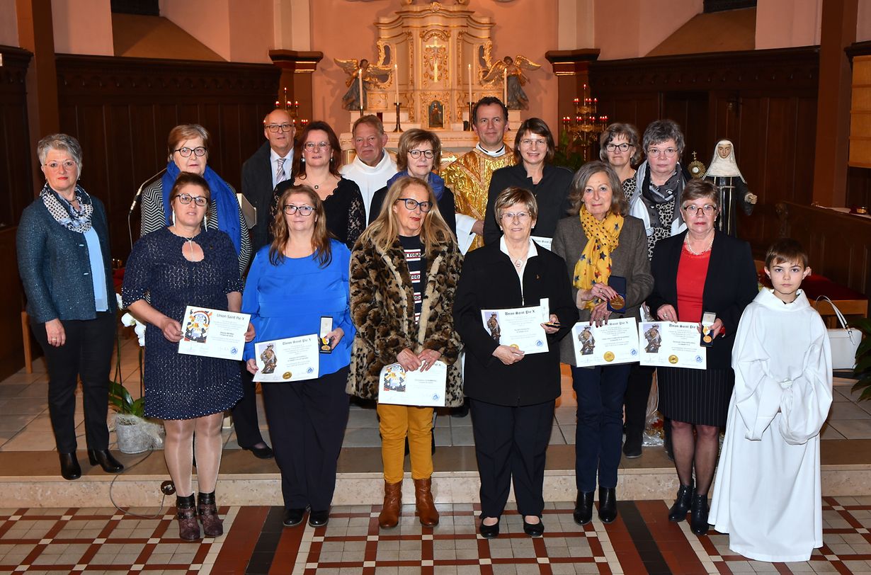 A Presenz vum UGDA Vertrieder Jean-Paul Kinnen huet d’Presidentin vun der Chorale Réiden, d’Marie Anne Seiter-Rings, enger Rei Sängerinne fir hire laangjärigen an treien Asaz Merci gesot an hinnen d’Medaille vum Piusverband iwwerreecht. Geéiert si ginn: Constance Schimberg a Vori Richea mam “Insigne de mérite fir 5 Joer, Marie-Paule Rasqué-Schaus mat der Pius-Medaille am Bronze fir 10 Joer, Raymonde Esser a Ria Riffer mat der Pius-Medaille am Gold fir 30 Joer, Marie Anne Seiter, Odette Glaesener a Christiane Scholtus mat der Pius-Medaille am Gold mat Palmette fir 40 Joer. Besonnesch geéiert, mat der Pius-Goldplakett fir 50 Joer, gouf d’Mouchi Fasbinder. Schonn als jonkt Meedche war d’Mouchi Sängerinn a sengem Heemechtsduerf Ueschdrëf, zesumme mat sengem Mann Fernand ass hatt zënter hirem Bestietnis aktive Member vum Réidener Gesank.