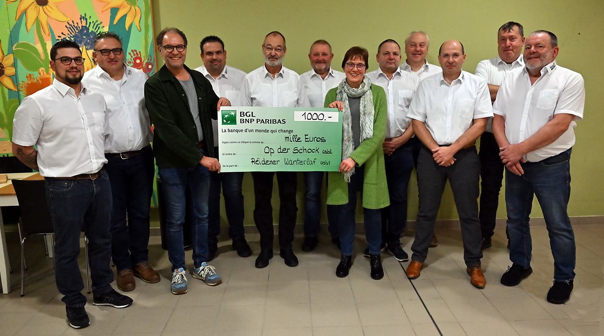 Réiden/Atert: „Lafen a Walken“ fir de gudden Zweck, ass di Mega- Veranstaltung, déi den dynamischen Veräin “Réidener Wanterlaf“ säit hirer Grënnung am Joer 2007 all Joers op en neis Ugangs Januar zu Réiden/Atert, organiséiert. Di Responsabel vum Réidener Veräin hun sëch vun Ufank un virgeholl, fir een Deel vum Erléis vun desem Event an och verschiddenen Aktivitéiten vum Joer, e gudd Wierk ze ënnersëtzen. Viru kuurzem war et nees esou wäit, wou de President Fernand Thill mat sengem Virstand di grouss Freed hat, fir am Kader vun enger Scheckiwerreechung an de Raimlechkeeten vun der Vereenegung „Op der Schock“ zu Réiden/Atert Scheck vun 1 000 Euro können ze iwerreechen. No hirem oprichtigem Merci fir de schéine Geste, huet de President Gérard Anzia zesummen mam Nicole Fisch, Direktiounsbeoptragt vun „ Op der Schock“ anhand vun enger detailléierter Power Point Presentatioun d’Aufgabegebiet erklärt déi sech fir d’Bedierfnisser vu Mënschen mat enger intellektueller Beanträchtegung asetzt an dobai hinnen eng Liewenqualitéit abidd, sou wéi hir berufflich a social Inclusioun och ze förderen. Dese Scheck gett och agesaat, fir all zousätzlich Käschten hëllefen ze finanzéieren, déi nit vum Staat ënnerstëtzt gin. Bleiwt ze erwähnen, dat de Réidener Wanterlaf mat desem Scheck säit 2007 di impressionnant d’Somm vu ronn 208 500 Euro fir gudd Wierker gespend huet. Di nächst Editioun vum Réidener Wanterlaf ass schon vir den 7. Januar 2024 zu Réiden virprogramméiert. (CR) (Foto: Charles Reiser)