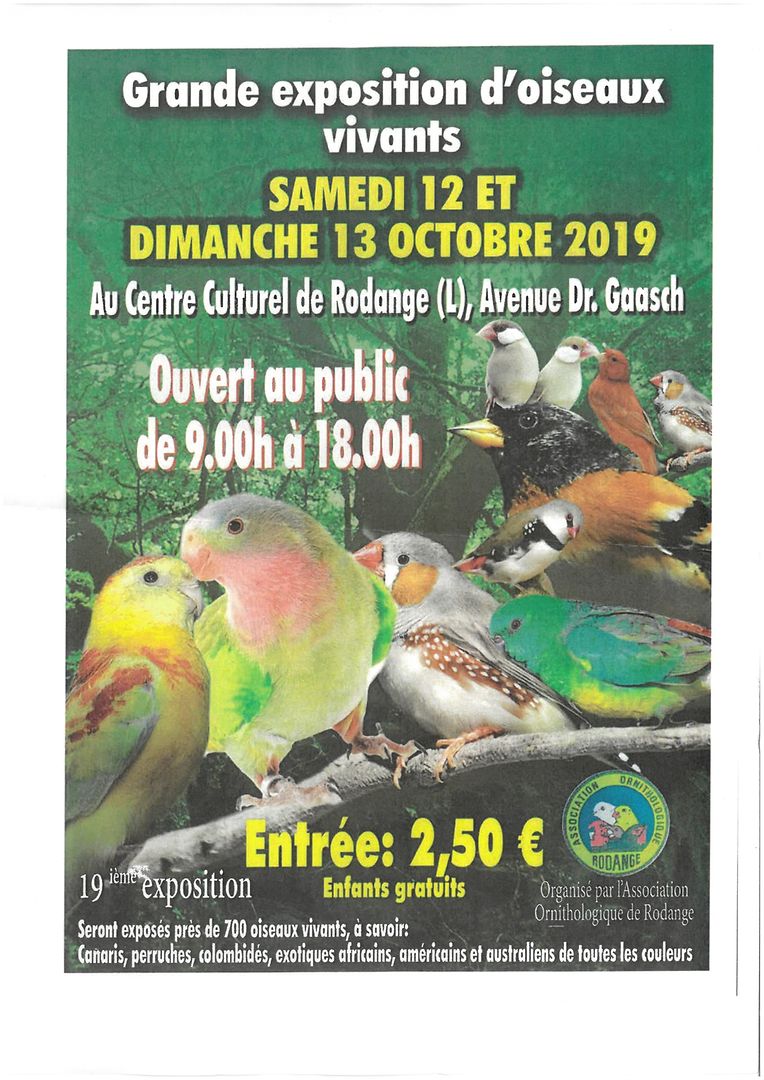 Les 12 et 13 octobre prochain, l'Association Ornithologique de Rodange tiendra sa 19e exposition internationale d'oiseaux vivants.