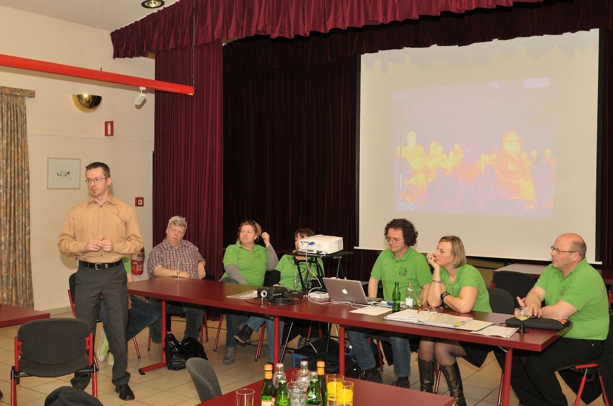 Am letzten Freitag lud der Theaterverein "Réiser Pëppelskäpp" zu seiner ordentlichen Generalversammlung in das Kulturzentrum "Edward Steichen" nach Biwingen ein. Neben den Mitgliedern des Vereins, die nahezu vollzählig erschienen waren, konnten die Verantwortlichen des Vereins auch Vertreter anderer Vereine und mehrere Mitglieder des Gemeinde- und des Schöffenrates begrüßen. In seiner Begrüßungsansprache blickte der Präsident des Vereins, Laurent Stoffel, auf die letzten drei Jahre zurück, die für den Verein äußerst erfolgreich waren. Innerhalb dieser Zeitspanne verdreifachte sich die Zahl der Mitglieder und die Zuschauerzahlen stiegen um 35 Prozent. Die Herausforderung für die nächsten Jahre besteht nun darin, die vor drei Jahren eingeschlagene Richtung, die sich als die richtige erwies, weiter zu verfolgen, um das qualitativ hohe Niveau der Vorstellungen aufrecht halten zu können. Sekretärin Nancy Holtgen trug dann den detaillierten Bericht über alle einzelnen Aktivitäten des Vereins vor, wobei die Zahl von 706 Zuschauern, die sich das Theaterstück "Hotel Mimosa" ansahen, besonders hervor stach. Kassierer Georges D'Orazio gab den Anwesenden anschließend Aufschluss über die finanzielle Lage des Vereins, die man als sehr gut bezeichnen kann. So war es auch dieses Jahr möglich, zwei Spenden von jeweils 500 Euro zu verteilen. Die erste Spende ging an die freiwillige Feuerwehr der Gemeinde Roeser, welche dieses Geld zur Anschaffung einer Wärmebildkamera nutzen wird. Die zweite Spende geht an "Solidaresch Hëllef Réiserbann", wo diese Summe den Start eines neuen Hilfsprojektes ermöglicht, das Pater Johny Geisen, der in Brasilien die Einwohnern der Favelas von Recife unterstützt, zu Gute kommt. Nächster Punkt auf der Tagesordnung war die Zusammensetzung eines neuen Vorstandes für drei Jahre. Die sechs Kandidaturen, die vorlagen, wurden per Akklamation gut geheißen. Präsident Laurent Stoffel wurde auch in seinem Amt bestätigt. Neben ihm gehören für die nächsten drei Jahre Georges D'Orazio, Mireille Friedrich-Klinski, Nancy Holtgen, Miche Mackel-Kieffer und Frédéric Tinant dem Vorstand an. Mit einem Geschenk wurden vorher noch die beiden austretenden Vorstandsmitglieder Danielle Loullingen und Jemp Mallinger aus ihrem Amt verabschiedet. Nachdem alle Punkte der Tagesordnung abgehakt waren, ergriff Bürgermeister Tom Jungen das Wort. Er bedankte sich im Namen der Gemeinde Roeser bei den Mitgliedern für die in den letzten drei Jahren geleistete Arbeit, die Qualität der Vorstellungen und das soziale Engagement des Vereins. Zum Abschluss der Versammlung konnten alle Anwesenden sich noch eine Fotoshow zum Theaterstück "Hotel Mimosa" ansehen, die von Dan Pereira zusammenstellt worden war.