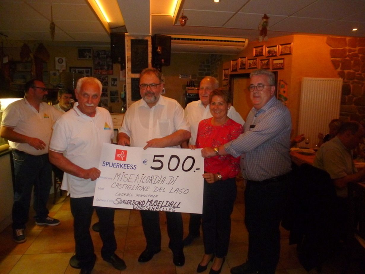 Iwer 2 Joer no den schlemmen Erdbeben an Italien liewen nach vill Leit an der Provenz Perugia, der Regioun Umbrien am Allgemengen an zu Castiglione Del Lago am speziellen an nët restauréierten Heiser oder an Zelter. Et feelt un all Ecken an Enn, u Geld an Ennerstëtzung. Et war fir d' "Chorale Municipale" Sängerbond Museldall Waasserbëlleg mat hierem Pianist Daniel Lang an hierer Dirigentin Viviane Kohn-Hames en Selbstverständlechkeet beim Spendenmarathon an der Taverne beim Baron zu Uesweller derbäi ze sin. D'Sänger hun nët nëmmen den opmierksamen an spendabelen Publikum mat bekannten italienischen Lidder duerch den Owend begleet, Neen, sie hatten och e Scheck vun 500€ matbruecht an konnten esou, zesummen mat denen 8000€ déi den Ernesto a seng Gäscht gespend haten, de gudden Zweck ënnerstetzen.