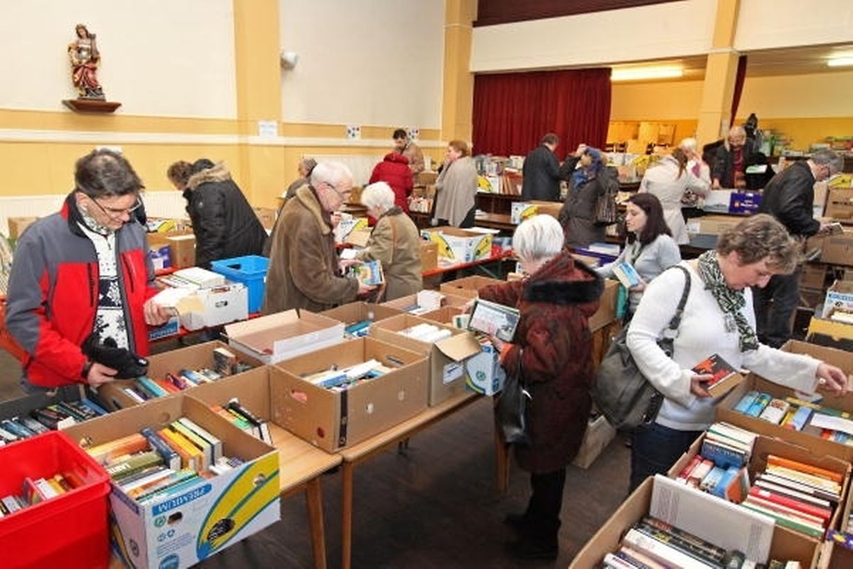 Laut Pastoralreferent Karsten Steil-Wilke war es dieses Jahr möglich, um die 6 000 gratis zur Verfügung gestellte Bücher zum Verkauf anzubieten. Die Besucher ließen nicht auf sich warten und den ganzen Sonntagnachmittag über wurde fleißig in den Kisten gestöbert. Das meiste Angebot gab es in deutscher, französischer und englischer Sprache; luxemburgisch und portugiesische Literatur war weniger auf Lager. Sämtliche Themen waren allerdings vertreten. Kinder verfügten über ihre eigene Wühlecke, wo es außer Bücher noch Video-Bänder DVD, CD und Gesellschaftsspiele gab. Bei einem Sozialpreis von 5 Euro pro Kilogramm durfte man mit vollen Armen zur Kasse schreiten, ohne die Geldbörse zu strapazieren. Eine Kaffeestube lud zum Verweilen ein und der Erlös dient dem Ankauf von neuen Büchern für die interkulturelle Pfarrbibliothek.(Text / Foto: Lucien Wolff)