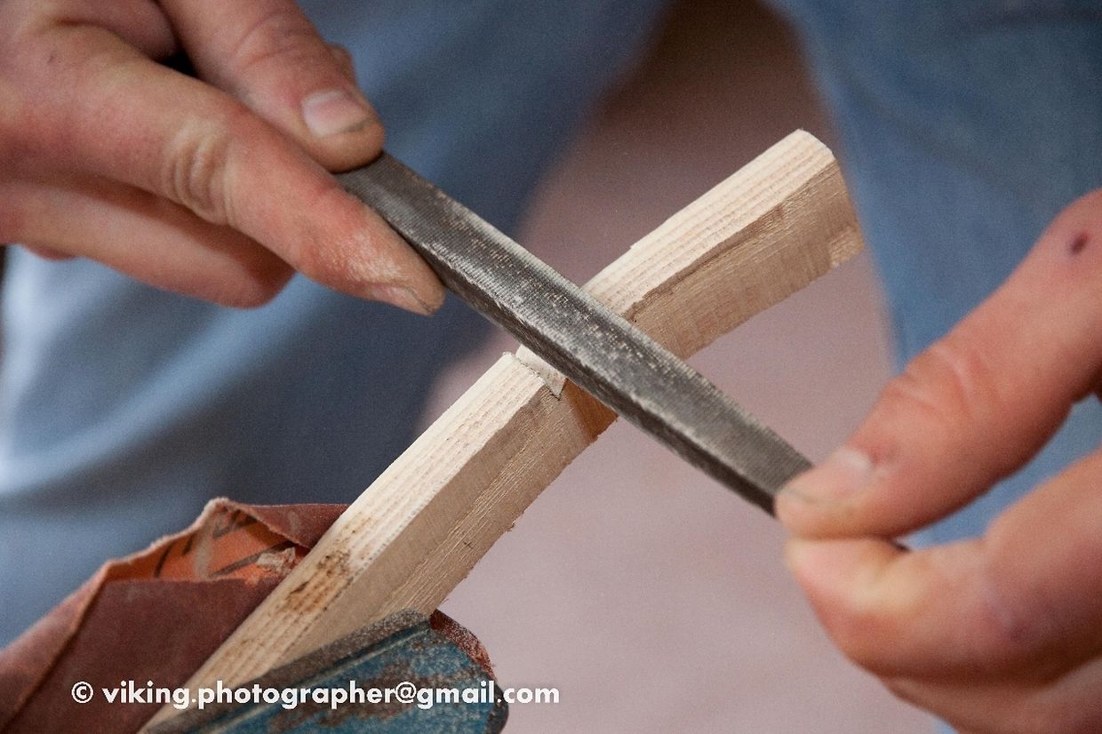Nachdem die Vorderseite des Bogens geglättet wurde, ging es ans Tillern, welches fast den ganzen Tag in Anspruch nahm. Nachdem beim Tillern der Bogen soweit nachbearbeitet wurde, dass beide Arme sich möglichst gleichmässig biegen, konnten wir auch den Rest des Bogens mit der Feile und dem Zieheisen bearbeiten.