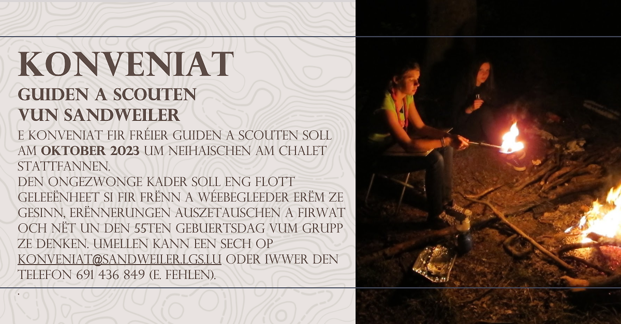 E Konveniat fir fréier Guiden a Scouten soll am Oktober 2023 um Neihaischen am Chalet stattfannen. Den ongezwonge Kader soll eng flott Geleeënheet si fir Frënn a Wéebegleeder erëm ze gesinn, Erënnerungen auszetauschen a firwat och nët un den 55ten Gebuertsdag vum Grupp ze denken. Umellen kann een sech op Konveniat@sandweiler.lgs.lu oder iwwer den Telefon 691 436 849 (E. Fehlen).