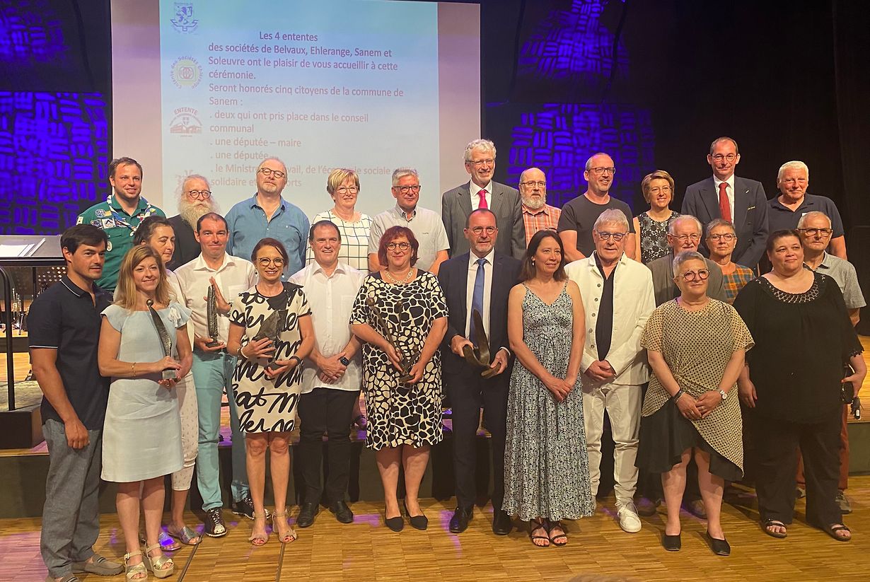 Alle 5 krute si e Kaddo iwwerreecht: jiddereen eng eege Skulptur vum Kënschtler Jhang Meis. D’Ovatioun ass vun de 4 Veräinsententë vu Bieles, Éilereng, Suessem an Zolwer organiséiert ginn – musikalesch gouf se vun engem Musekerensembel aus de 4 Museksveräiner ënnermoolt.